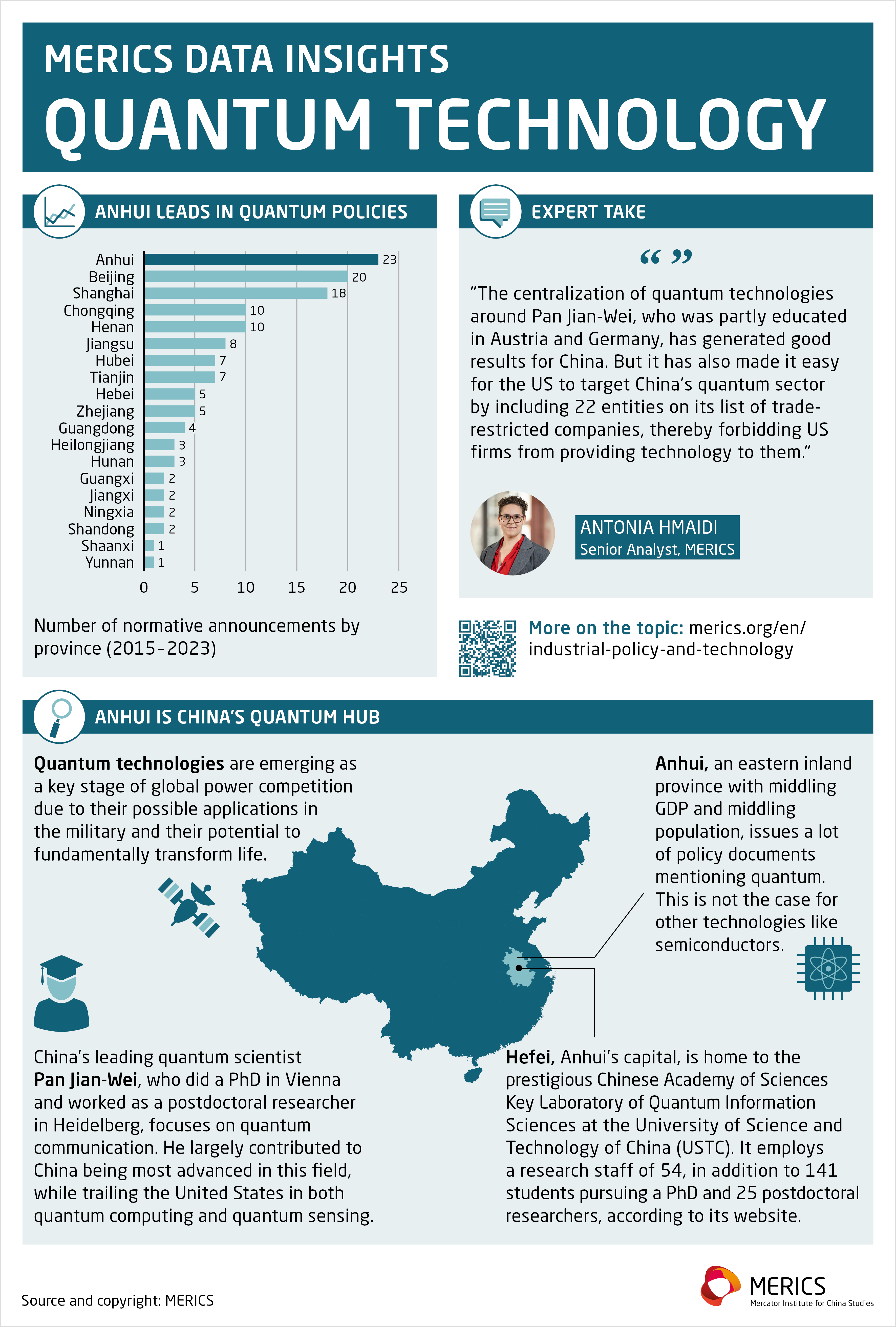 MERICS Senior Analyst Antonia Hmaidi sheds light on Anhui’s role as China’s quantum hub in this first issue of "MERICS Data Insights", a new feature combining data visualization, our experts’ take and facts and context about key developments in China.