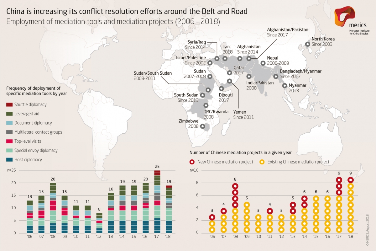 Recent years have seen significant changes in China’s international mediation activities. In countries like Afghanistan, Bangladesh, Syria and Israel, among others, diplomats from China increasingly engage in preventing, managing or resolving conflict. In 2017 Beijing was mediating in nine conflicts, a visible increase compared to only three in 2012, the year when Xi Jinping took power as General Secretary of the Chinese Communist Party (CCP).