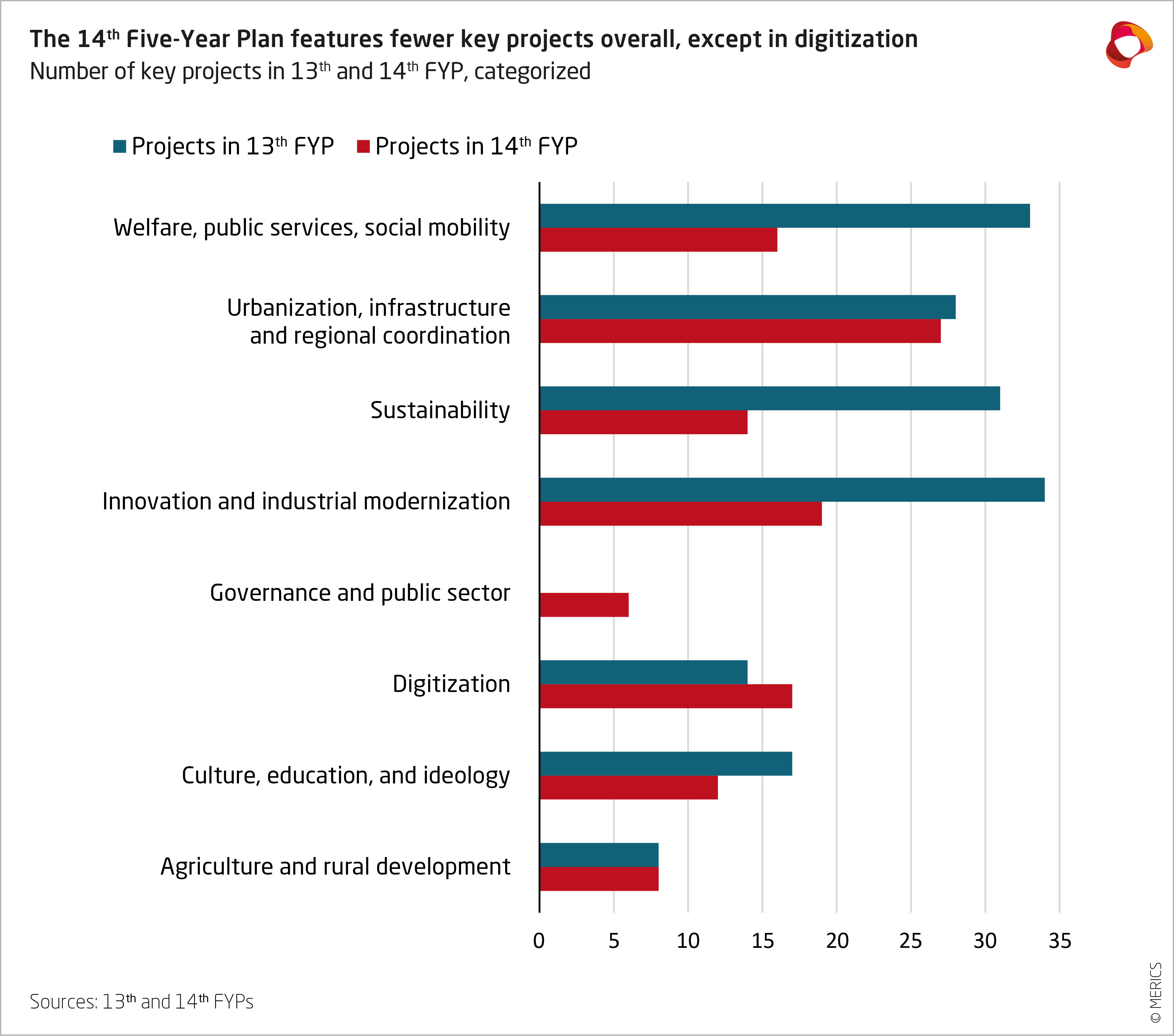 A new main section on digitization shows that it remains a key priority. The word “digital” (数字) is mentioned 80 times compared to four times in the 13th Five-Year Plan. There is a qualitative shift from the 13 th plan, which was more about building digital foundations, to the 14th plan, which is now pushing general application of digital and smart solutions in the economy, governance and the social sector. National security is another key issue and increasingly named together with food, energy, technology and even cultural issues.