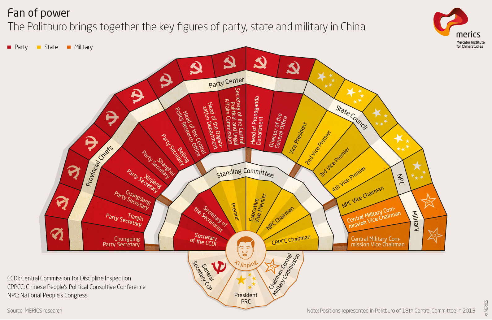 In the five years since Xi Jinping became general secretary of the Chinese Communist Party (CCP), China’s political system has experienced profound changes. Nevertheless, it can be expected that most portfolios depicted in this infographic will still be part of the Politburo and its Standing Committee in the 19th Central Committee.