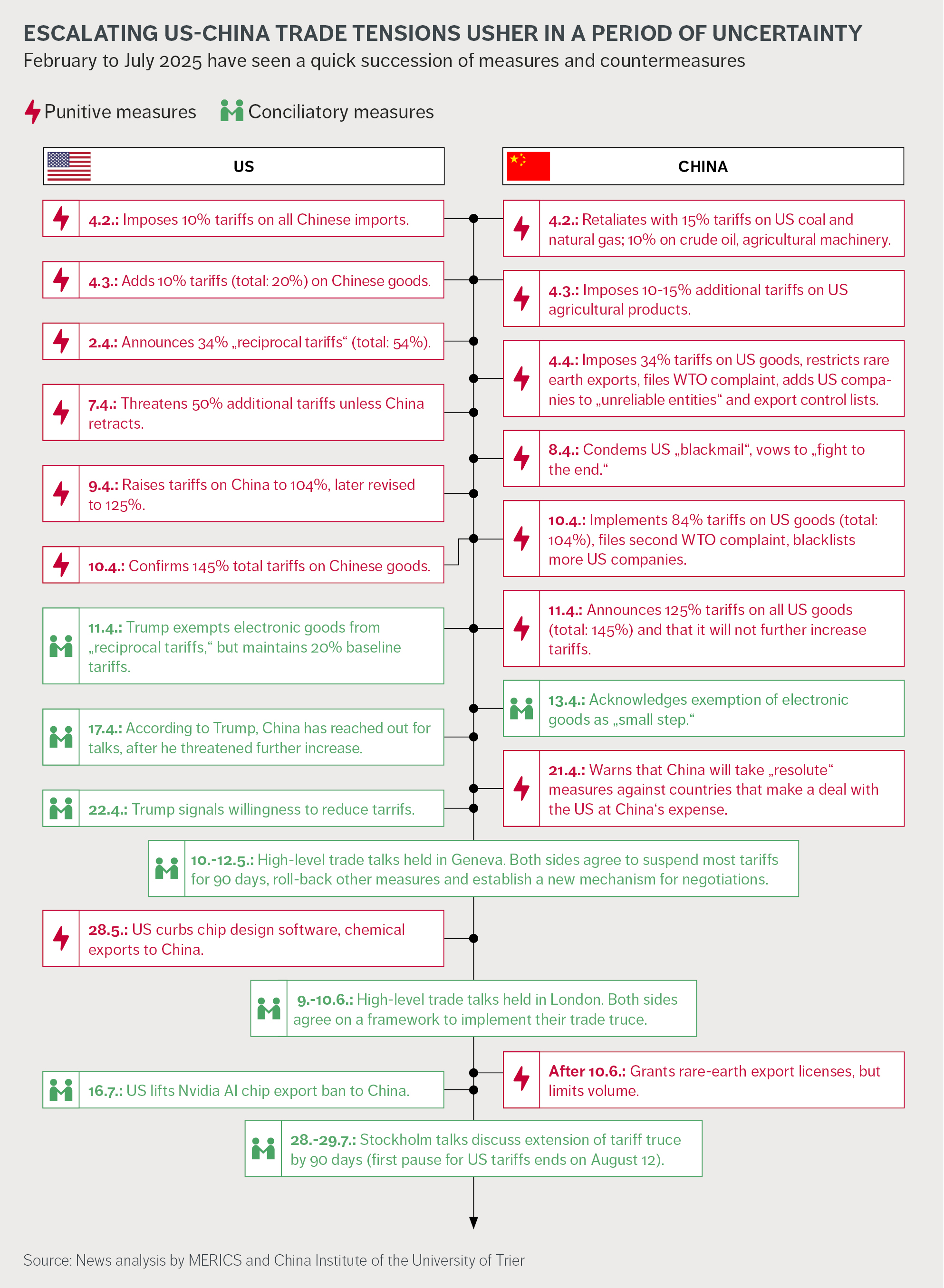 China and the US remain interlocked in a fierce trade conflict. Starting from February 2025, the rapid crossfire included staggering tariffs and a host of measures and countermeasures (see timeline). High-level talks in May, June and Juli in Geneva, London and Stockholm brought a temporary ceasefire. Both countries have resumed exports of key products. But a baseline of new tariffs is set to stay in place, and each side keeps accusing the other of undermining the precarious truce.