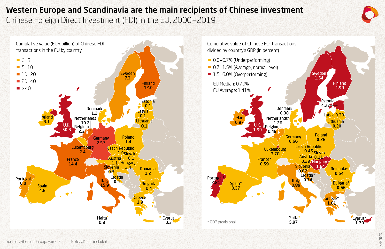 Between 2000 and 2019, most of Chinese Foreign Direct Investment (FDI) in Europe has flowed to Western European and Scandinavian countries. China’s pursuit of technology for its industrial upgrading has led to a souring of attitudes towards Chinese investment over the years. In 2016, a surge of state-led Chinese investment in Europe (EUR 36 billion) led France, Germany and Italy to ask the European Commission to draw up a pan-European FDI screening framework to protect strategic industries. This finally became operational in October 2020. Eastern European countries, who have repeatedly received investment pledges by Chinese leaders at 17+1 summits, have yet to receive the promised financing.