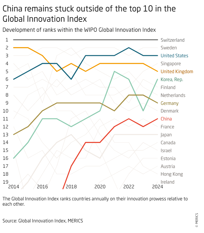 In 2024, China’s leadership continued to emphasize the centrality of science and technology to the country’s future. Results have been mixed, which is best reflected by China’s slow progress on the Global Innovation Index, an authoritative annual ranking published by the UN-affiliated World Intellectual Property Organization (see graph below).