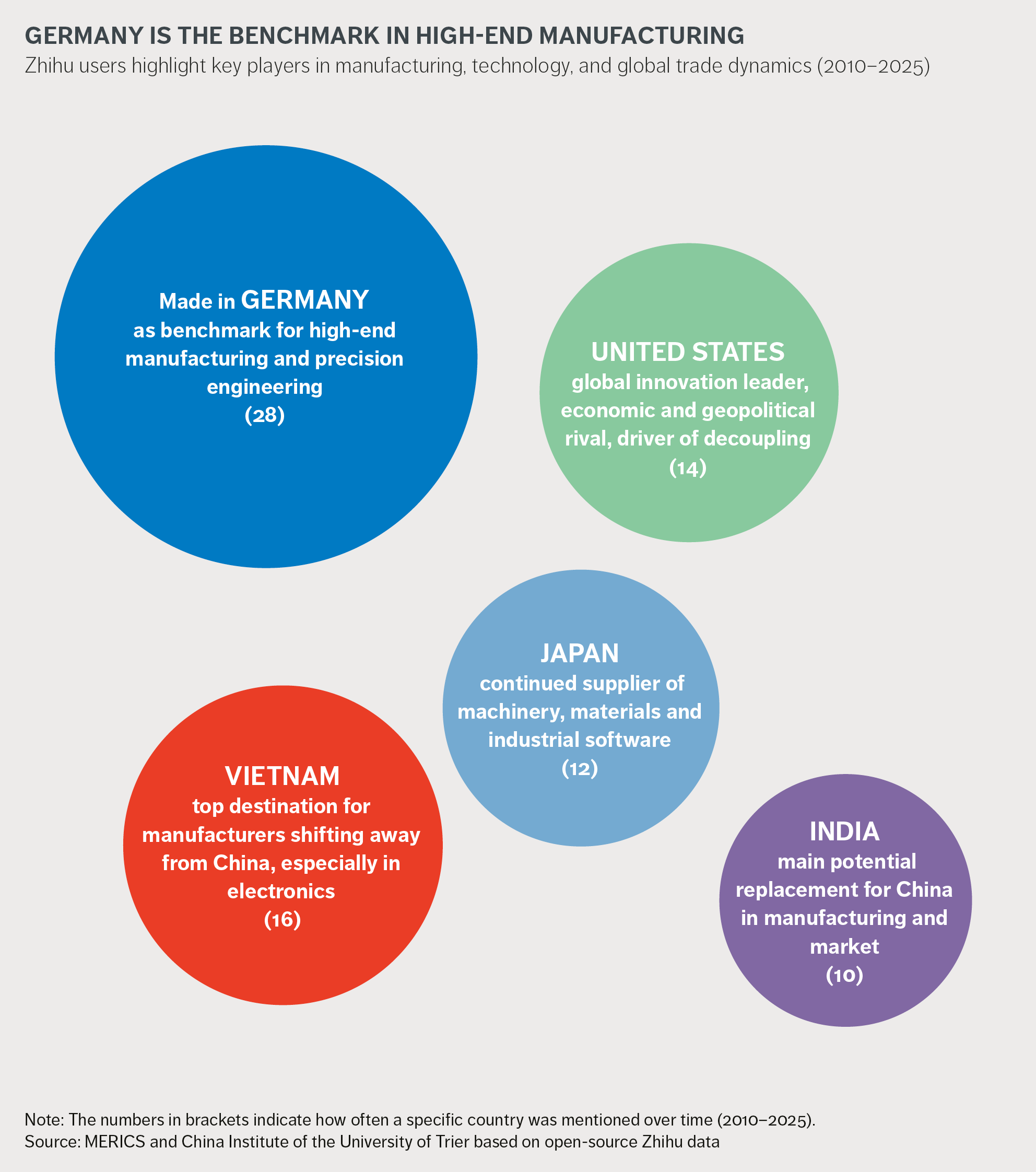 The discussions also show how users frame China‘s industrial development in relation to key global players. While Germany for example is seen as the gold standard for manufacturing quality, the US appears as China‘s main geopolitical rival.