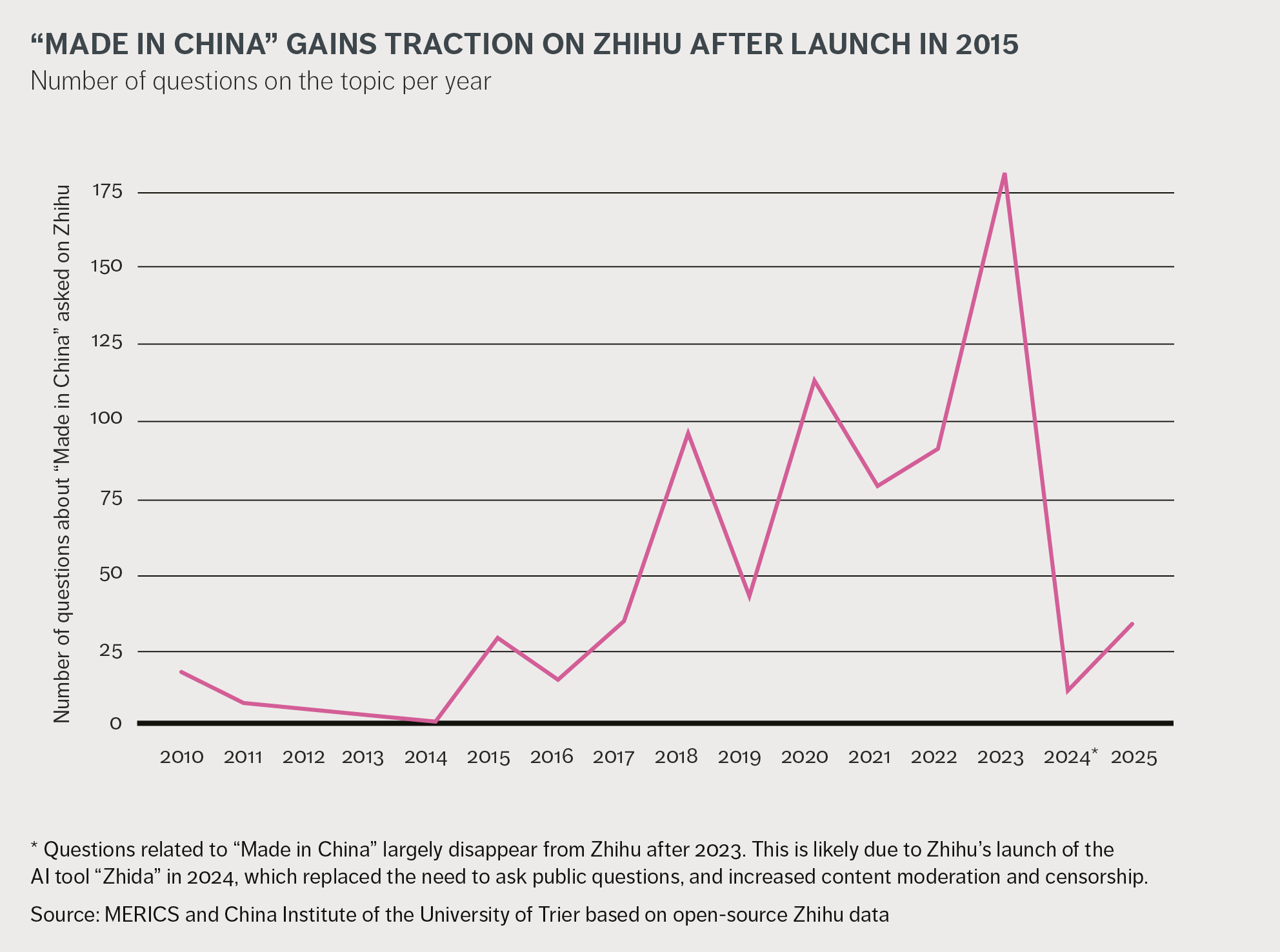 To tap into those debates, we explored public discussions on the Zhihu topic page titled “中国制造” (Made in China). We focused on a broad range of question-and-answer threads, covering content posted between December 2010 and March 2025.