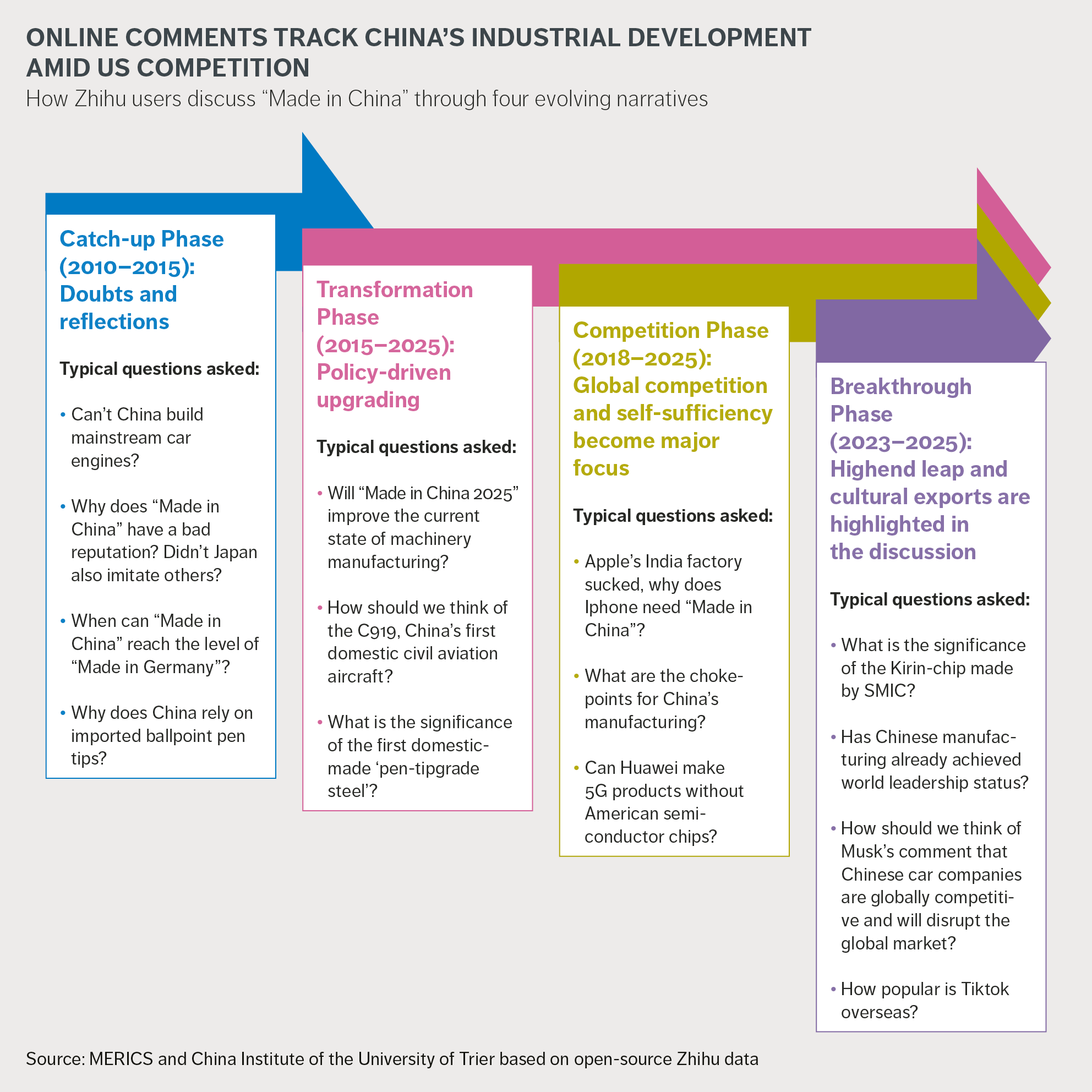 Despite silence at the top, public discussion of China’s industrial ambitions is still very much alive – particularly on Zhihu, a widely used question-and-answer platform that draws in tech-savvy users and industry professionals. Unlike entertainment-oriented platforms like Weibo or more state-aligned sites such as Guanchazhe, Zhihu fosters more in-depth and open exchanges. This makes it a valuable resource for exploring how people in China discuss and assess the development of Chinese manufacturing more broadly.