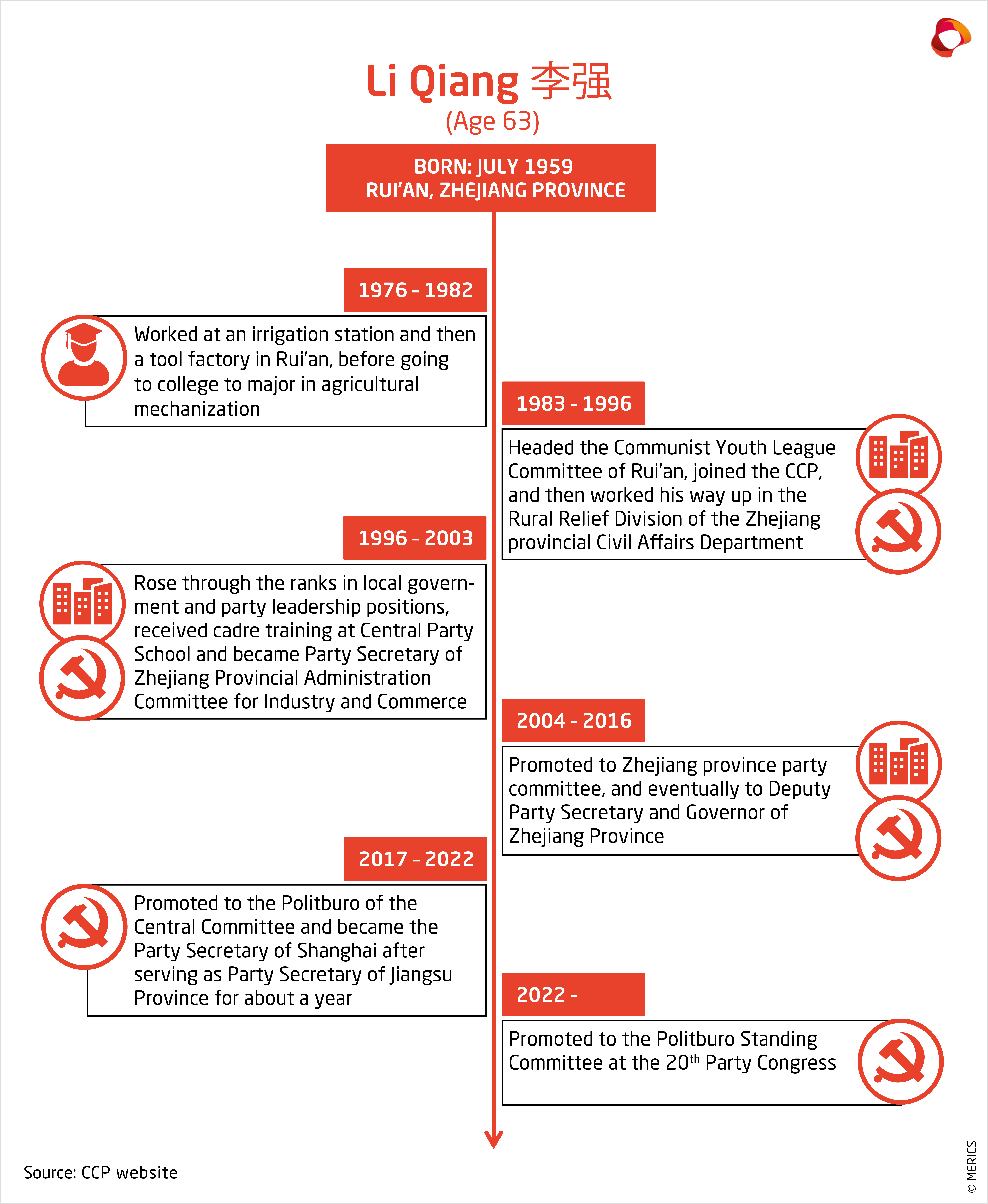 Li, a Zhejiang native, served as Xi Jinping’s chief of staff from 2004 to 2007, when Xi served as party chief of the province. He was also by Xi’s side at the latter’s first state visit to the United States in 2015. After starting as a worker, first in drainage and irrigation then at a tools factory, Li joined the Chinese Communist Party in 1983 and worked his way up in the Civil Affairs Department of the Zhejiang government before taking on party leadership roles in the province. The Shanghai Party Secretary post, which Li was promoted to in 2017, has always been regarded as a stepping stone to ascend to the highest leadership positions in the party. All but one of Shanghai’s party secretaries in the last 25 years, were promoted to the Politburo Standing Committee, the highest locus of power in China.