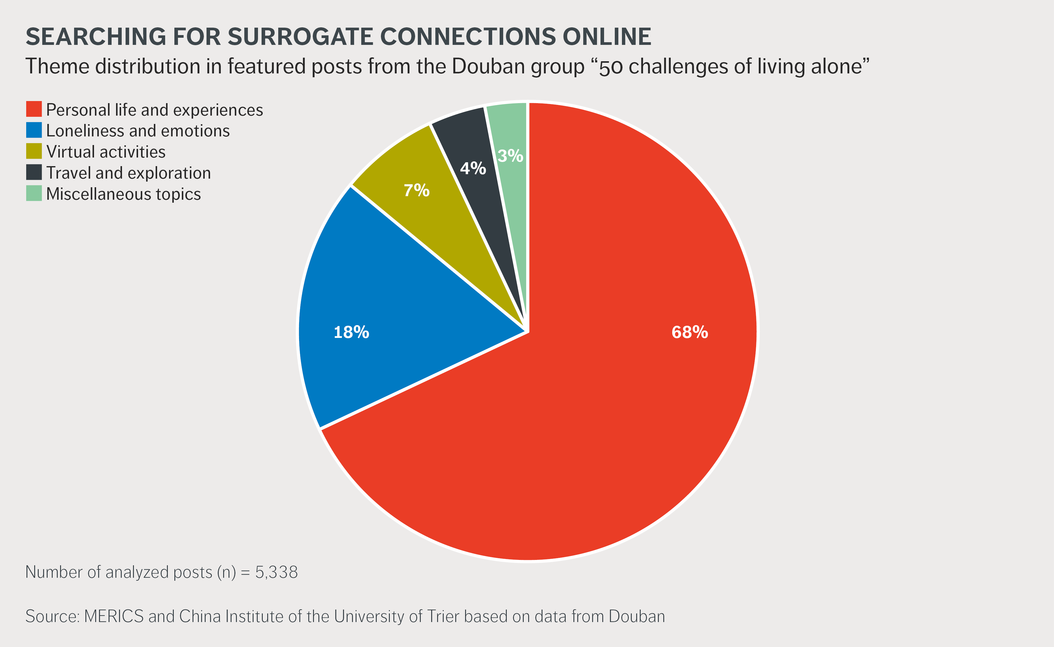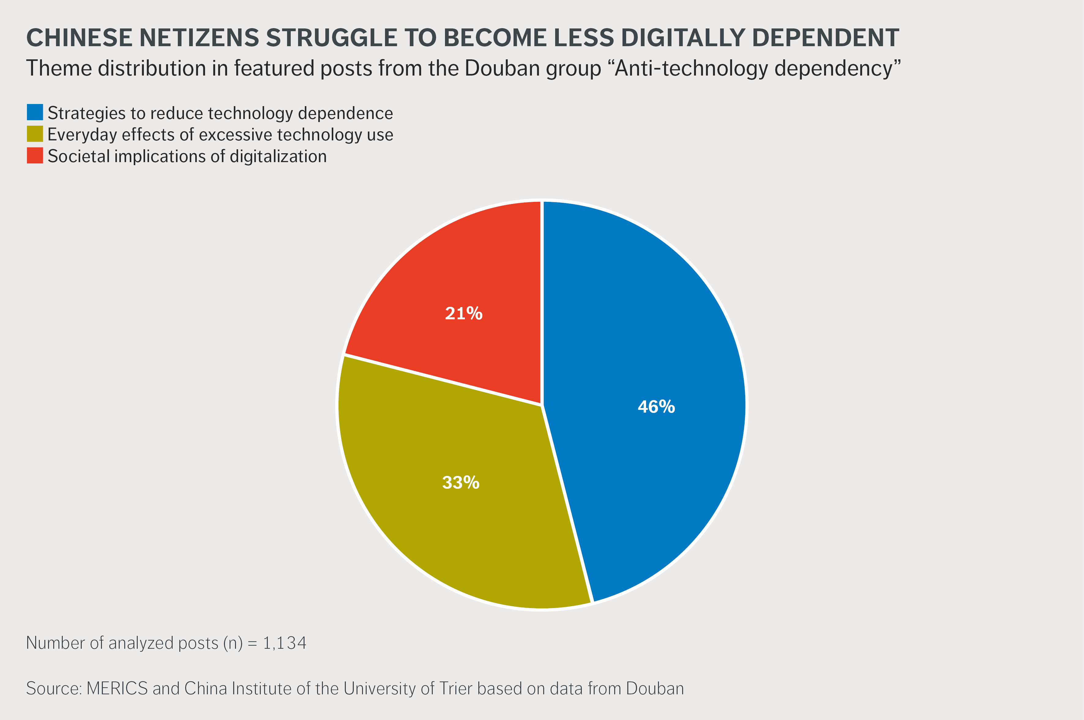To understand how netizens in China are coping with an omnipresent digitalization, we identified and analyzed two online communities on the Chinese social media networking site Douban.1 The “Anti-technology dependency” group (反技术依赖小组) questions existing technological structures by exchanging ideas and examples for new, less technology-dependent behaviors. In contrast, members of the group “The 50 challenges of living alone” (独居的50个挑战) use digital technologies to reproduce social structures online to meet their social needs that are difficult to fulfill when living alone.