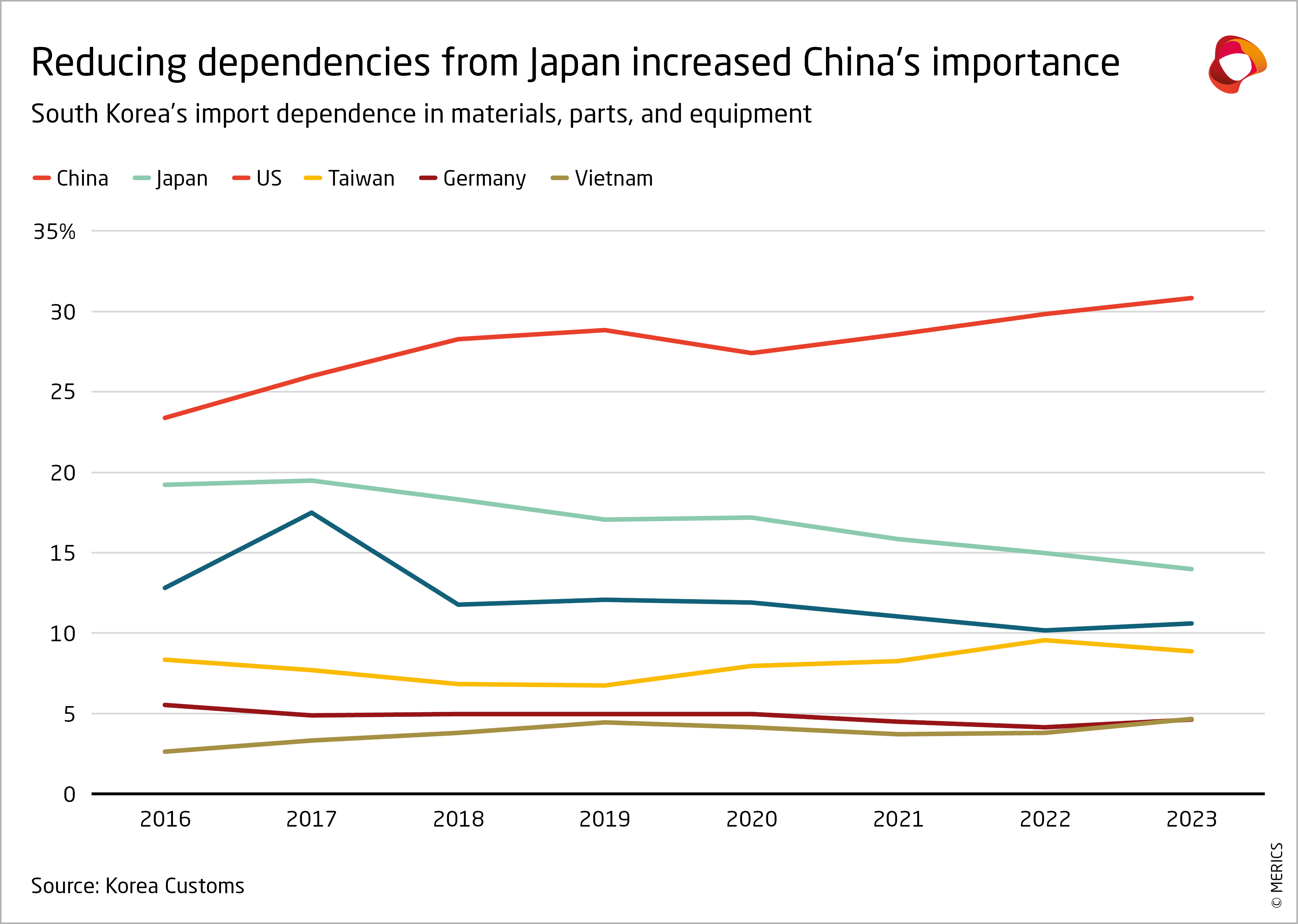 For instance, in July 2020, the South Korean government implemented the “Materials, Parts, and Equipment Strategy 2.0.” This initiative fosters a collaborative domestic ecosystem, aiming to transform Korean companies into central hubs and vital partners within global supply chains. This enabled South Korea to mitigate structural vulnerabilities in general – not only China related ones, while expanding international cooperation with the United States, Europe, and Southeast Asia.