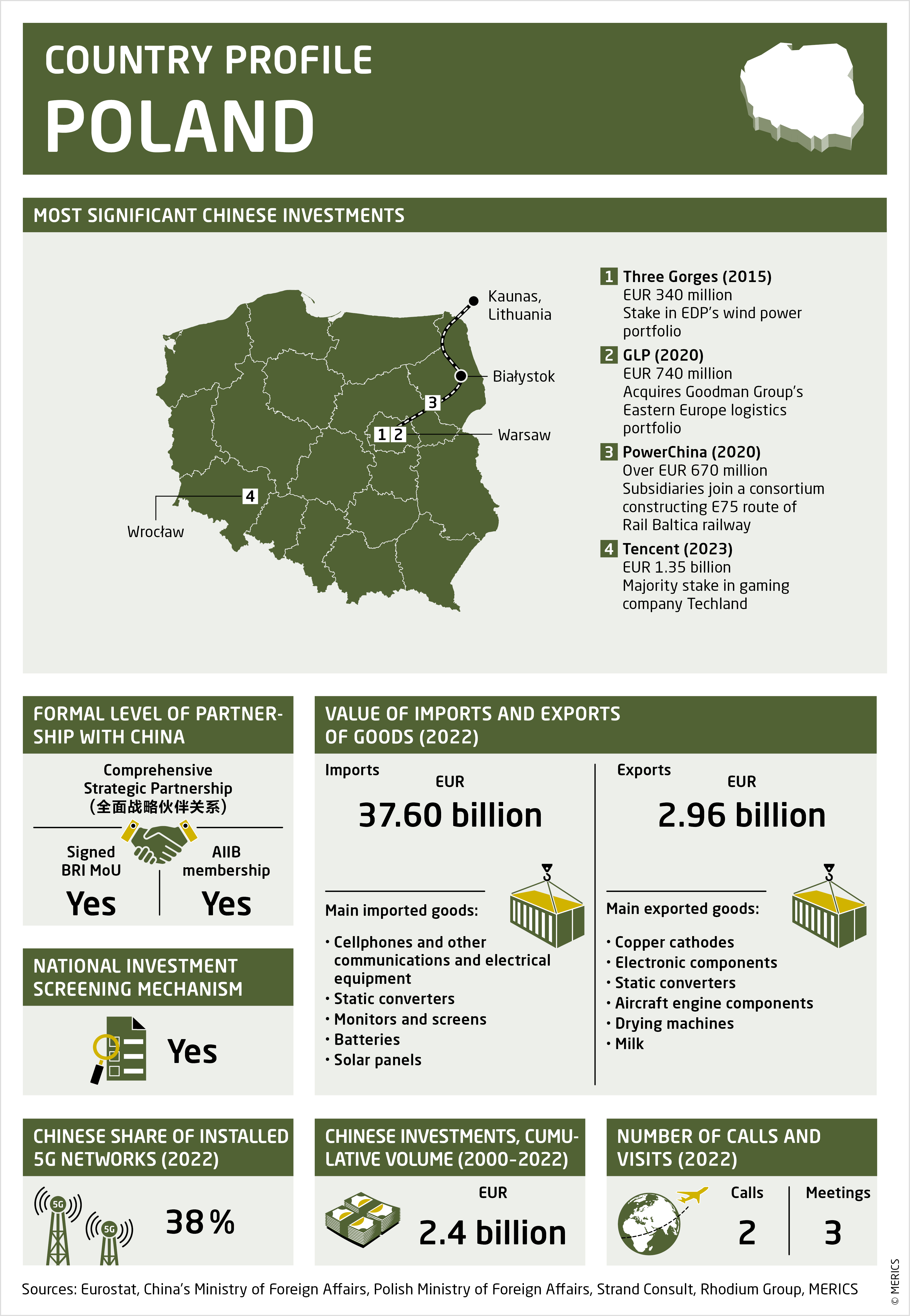 Chinese FDI into Poland is low: only EUR 200 million was invested there between 2020 and 2022, according to Rhodium Group data. Negative views of China have also changed Poland’s stance on foreign investments. It amended its foreign investment screening mechanism in 2020, expanding the list of sectors and entities it covers. China is one of the countries implicitly in focus, though the mechanism is country agnostic.