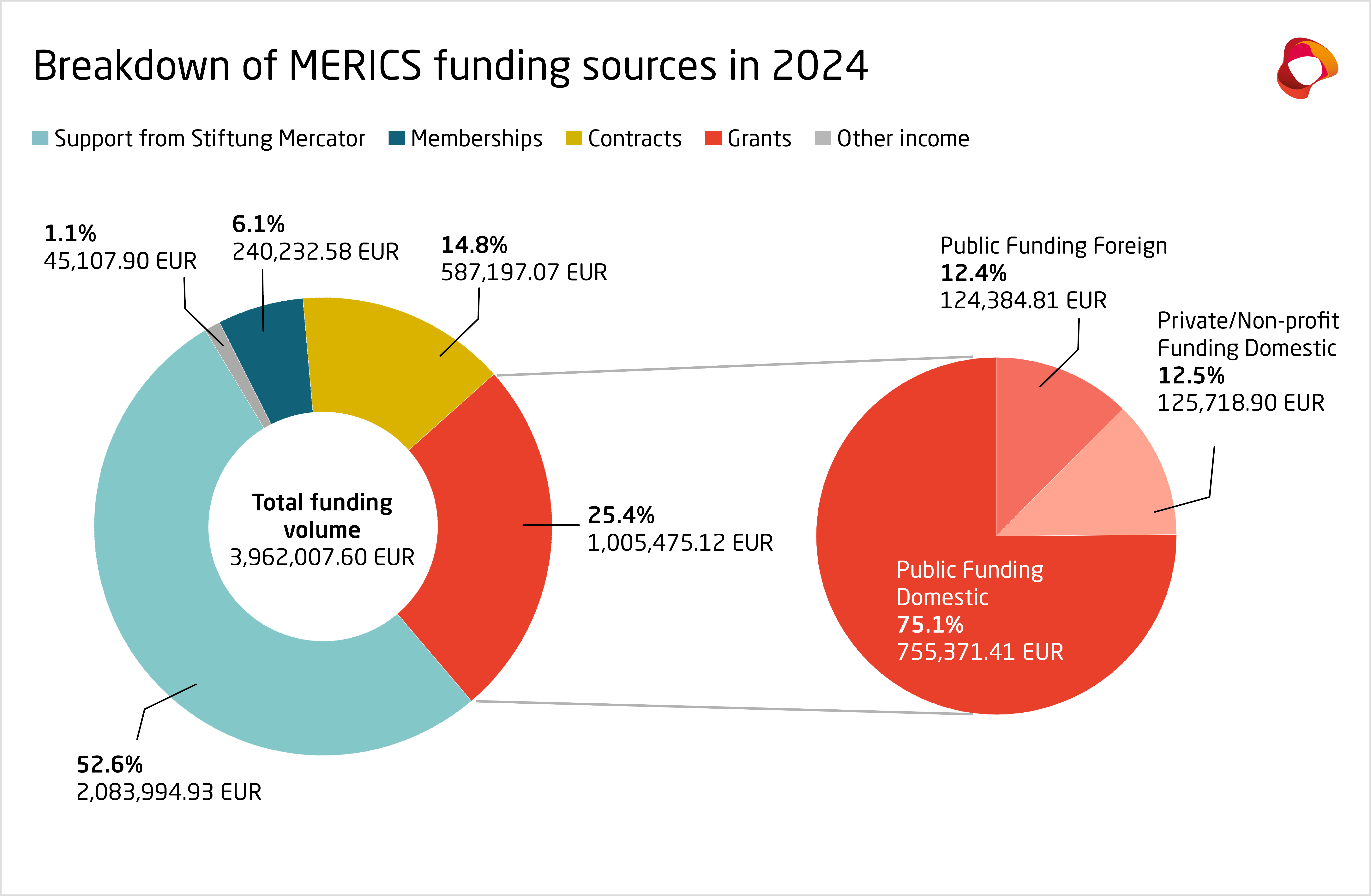 Providing 52.6 percent of total funding, Stiftung Mercator was the most important institutional funder of MERICS in 2024. The MERICS budget for the year amounted to 3,962,007.60 euros. In the third funding phase (2024-2028), Stiftung Mercator is supporting MERICS with funding totaling 12 million euros.