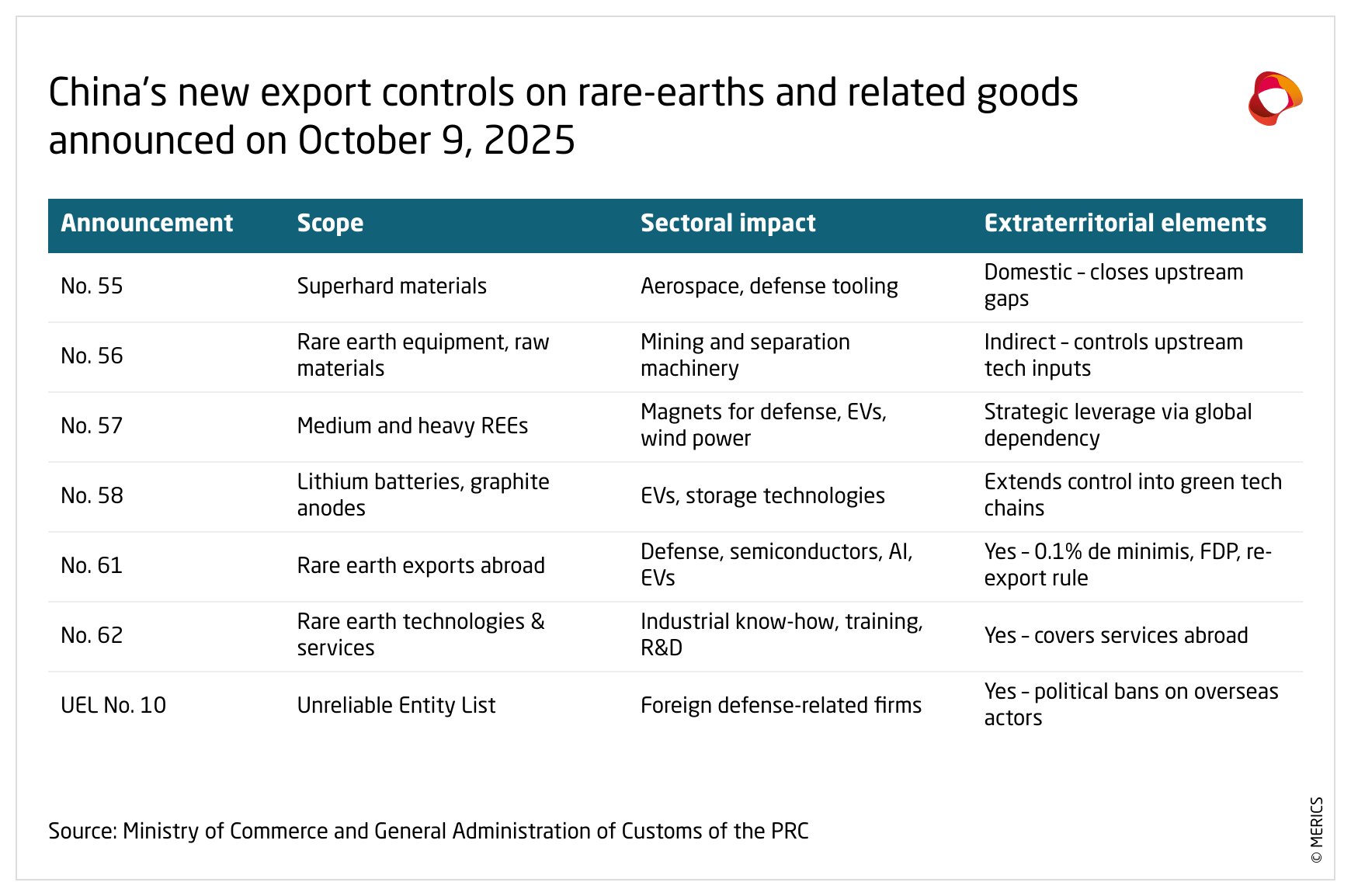 - Adding a de minimis threshold of 0.1% of total value coming from rare earths and related goods while also creating rules comparable to the US Foreign Direct Product Rule (FDPR), which gives the US its long-arm jurisdiction.