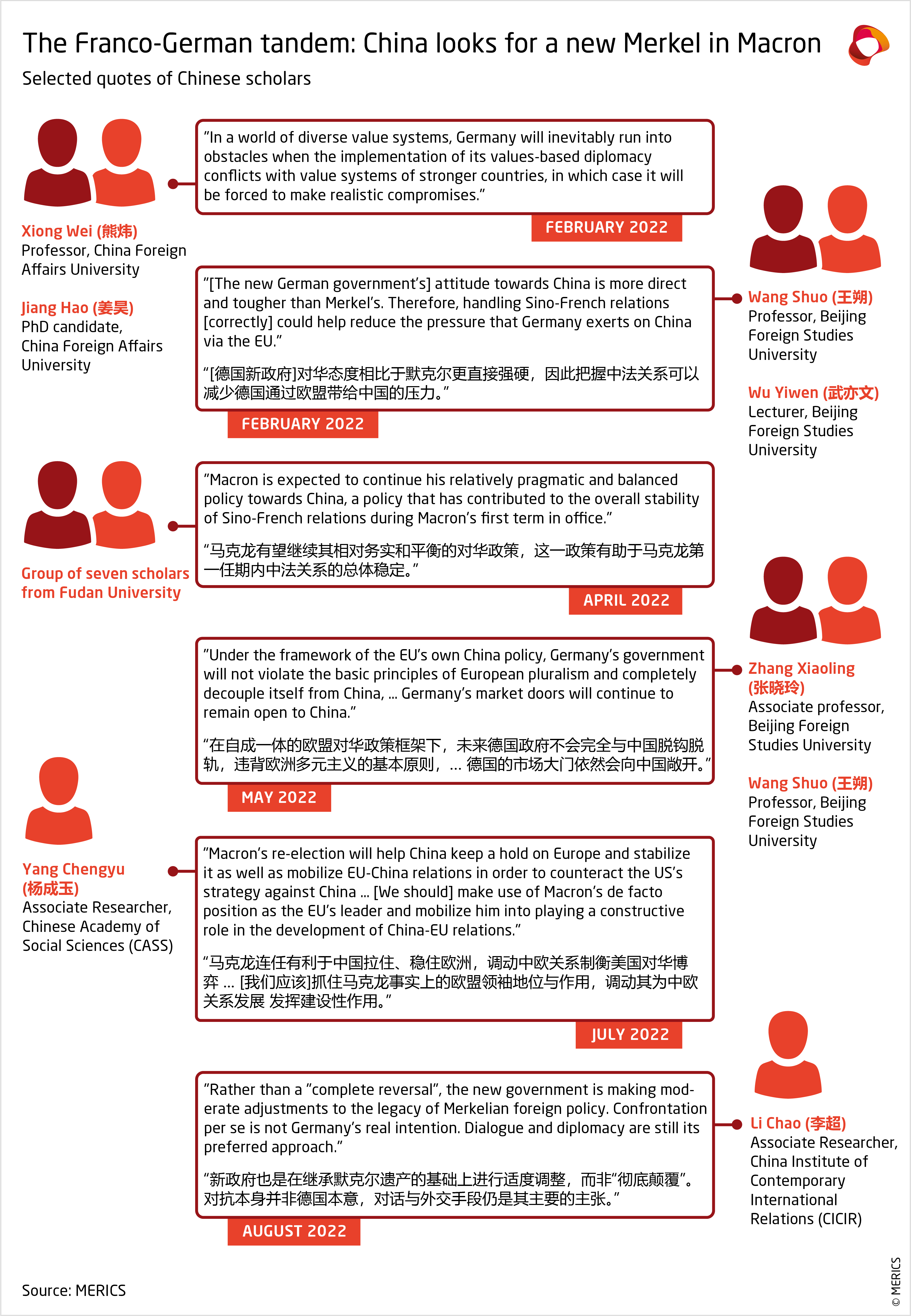 Germany and France are believed to be preparing back-to-back state visits to China in November – a few weeks after President Xi Jinping is expected to secure a third five-year term in office. Much has changed since German and French heads of state last visited Beijing in 2019. Tensions between European countries and China have risen markedly and the “business as usual” approach to pre-pandemic exchanges is likely to be a thing of the past. In this issue, we provide a short overview of the evolving dynamics of Sino-German and Sino-French relations as perceived by Chinese scholars. Whereas Merkelian Germany was once considered China’s most “pragmatic” (务实) and stable partner in the EU, this is changing. Interest within China is shifting increasingly towards France.
