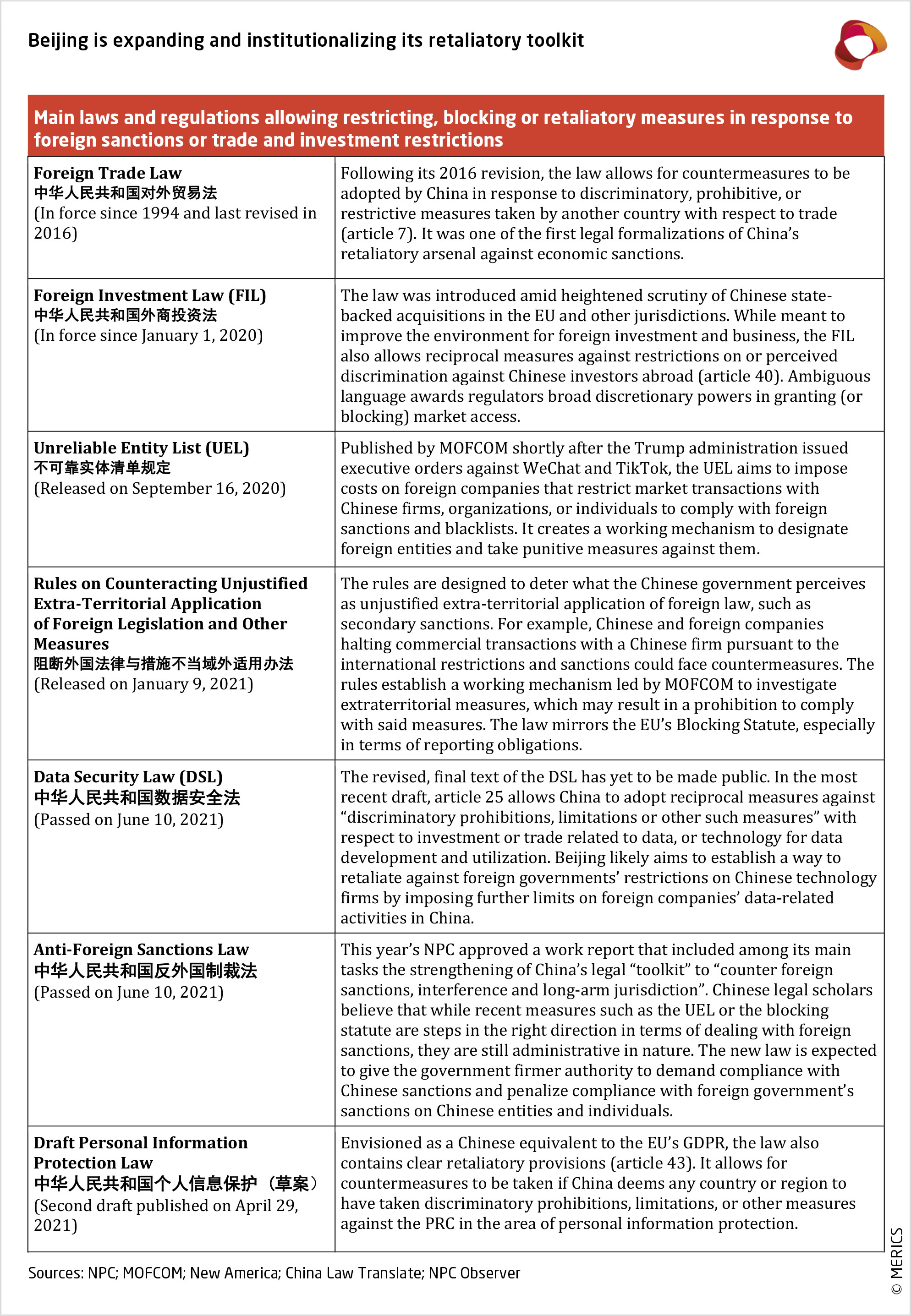 In light of these actions, Beijing is expanding its own retaliatory toolkit against sanctions and other acts it regards as discriminatory or otherwise unjustified treatment (see table below).