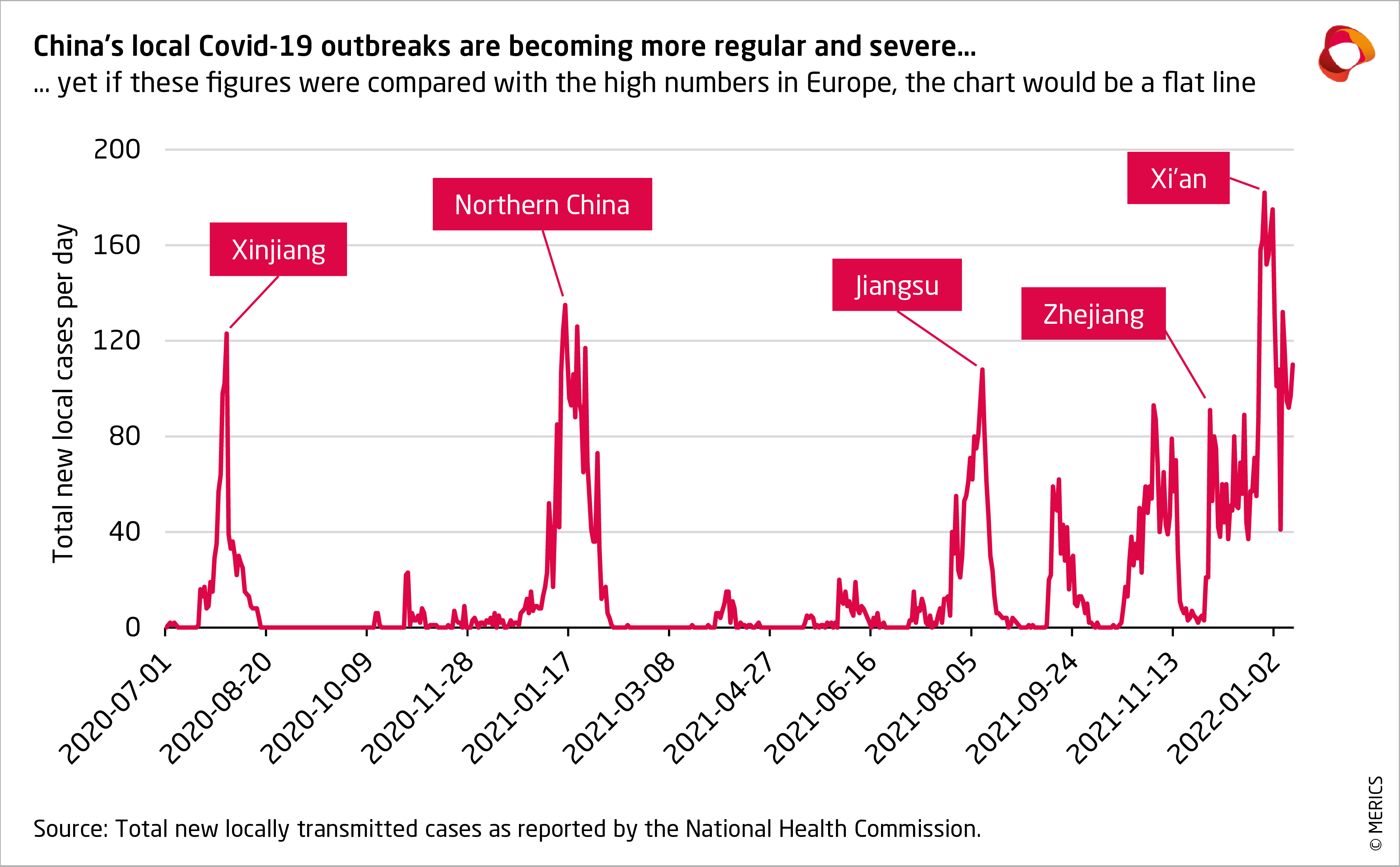 MERICS analysis: “China’s authorities are confident that its refined strategy will be able to beat Omicron, just as it has rather successfully done with other variants. On balance, dynamic zero is still the best choice for China compared with the high case numbers and loss of life throughout Europe. Yet, for China the social and economic costs of maintaining its strategy are constantly increasing. The timing of the outbreak in Tianjin must also have Beijing concerned. Any major outbreaks in the capital would certainly take away the shine surrounding the approaching Olympics,” says MERICS Analyst Vincent Brussee.