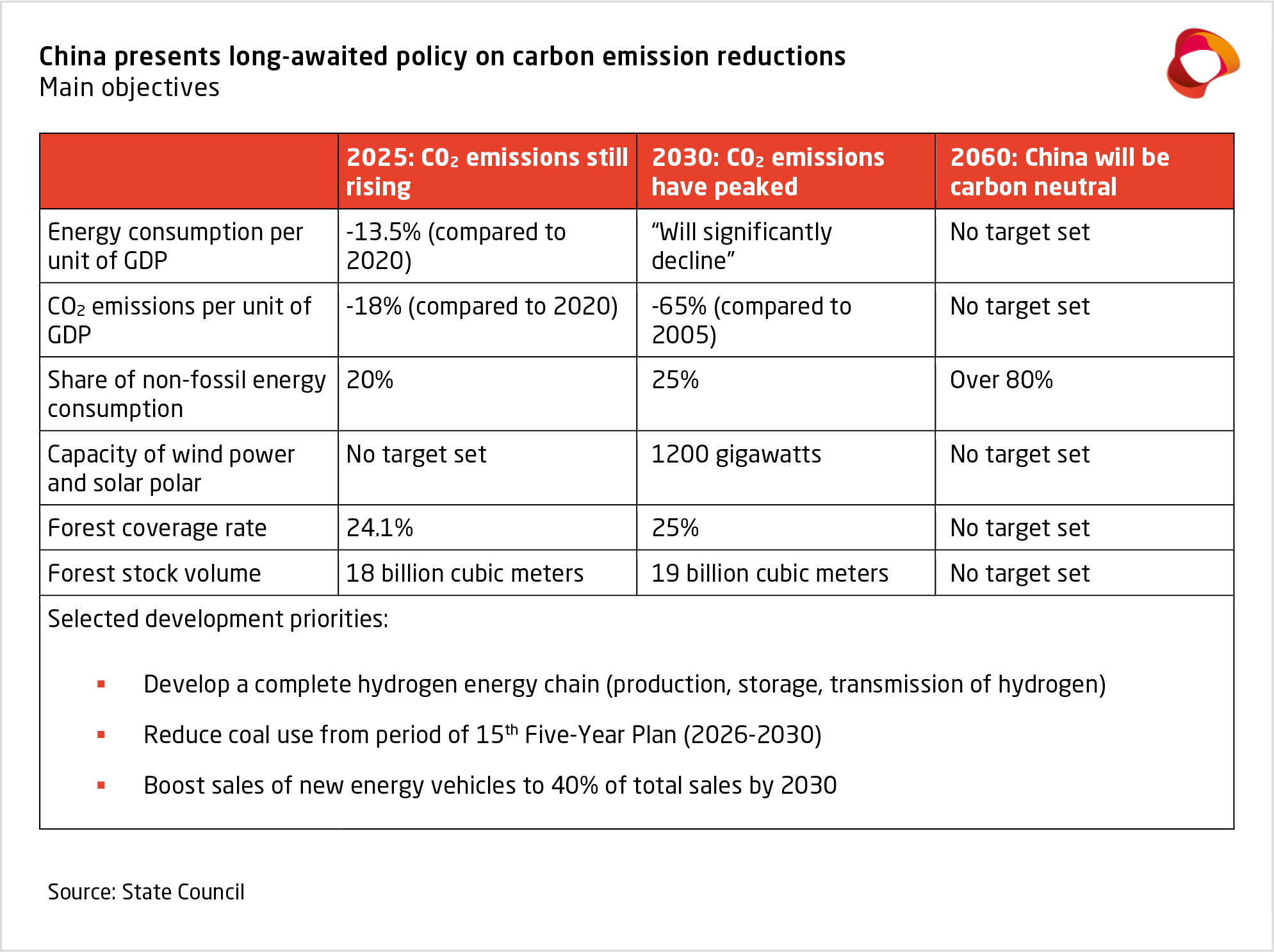 China’s State Council on October 24 released a long-awaited framework for the country to reach its CO2-emissions peak by 2030 and “net zero” emissions by 2060. Released just days ahead of the UN Climate Summit COP26 in Glasgow which starts on October 31, the document is meant to provide the foundation for China’s climate policy for decades to come. It codifies the pledges Beijing made in the last year in one top-level document and defines the path for ancillary policies. After China earlier this year failed to update its UN climate targets, its Nationally Determined Contributions (NDC), the new document’s main objectives are likely to serve as the country’s new NDCs.