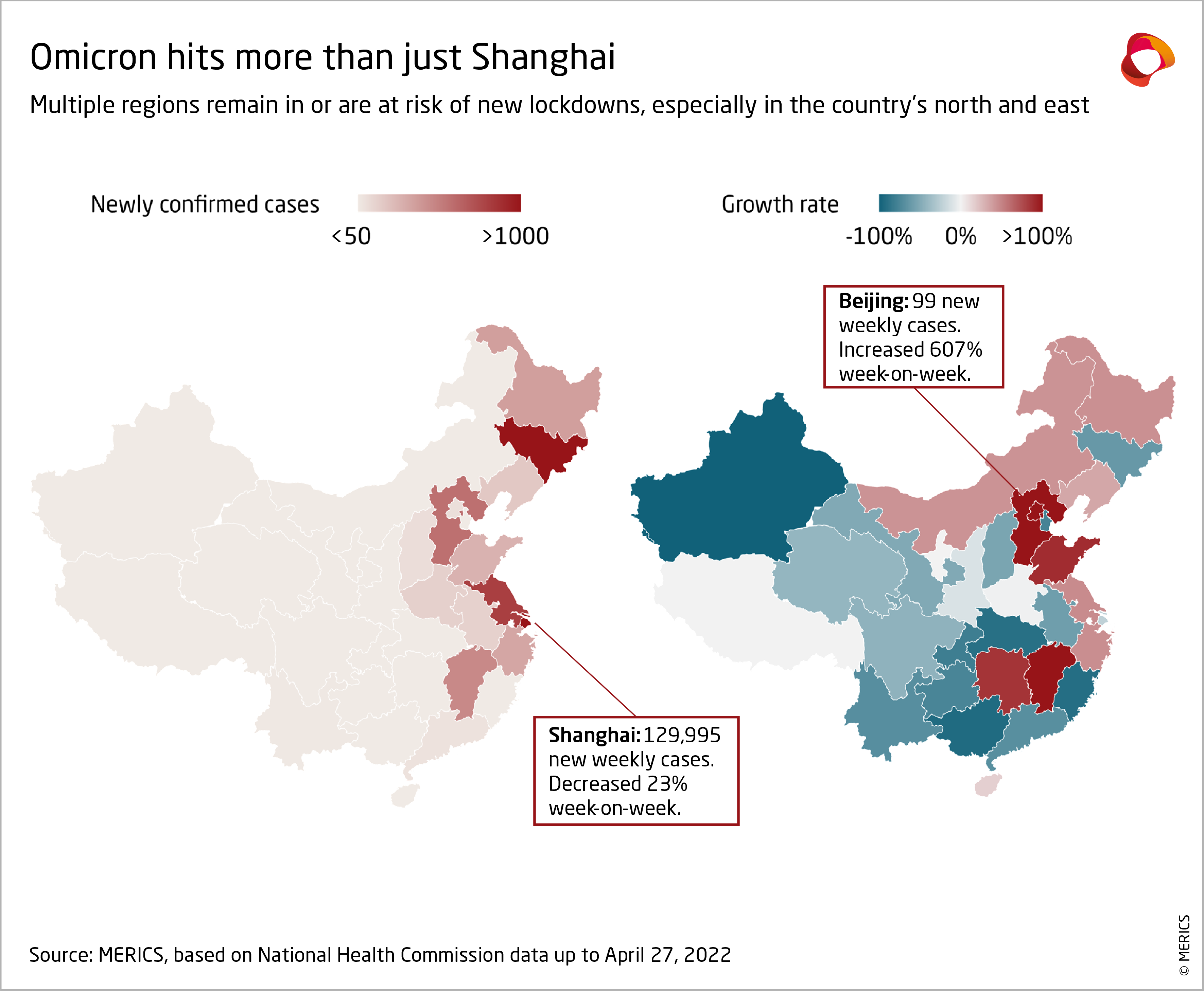 MERICS analysis: “While some regions of the world eliminated remaining Covid restrictions, China is having its worst outbreak since the start of the pandemic. The measures are also being taken in a very different context to that two years ago, when the global economy as a whole was scaling down”, says MERICS Analyst Aya Adachi. “Many economies that rely on Chinese imports are now transitioning to a post-pandemic return to normality. China will likely present them with major supply-chain problems, as a growing number of Chinese cities are in various stages of lockdowns.”