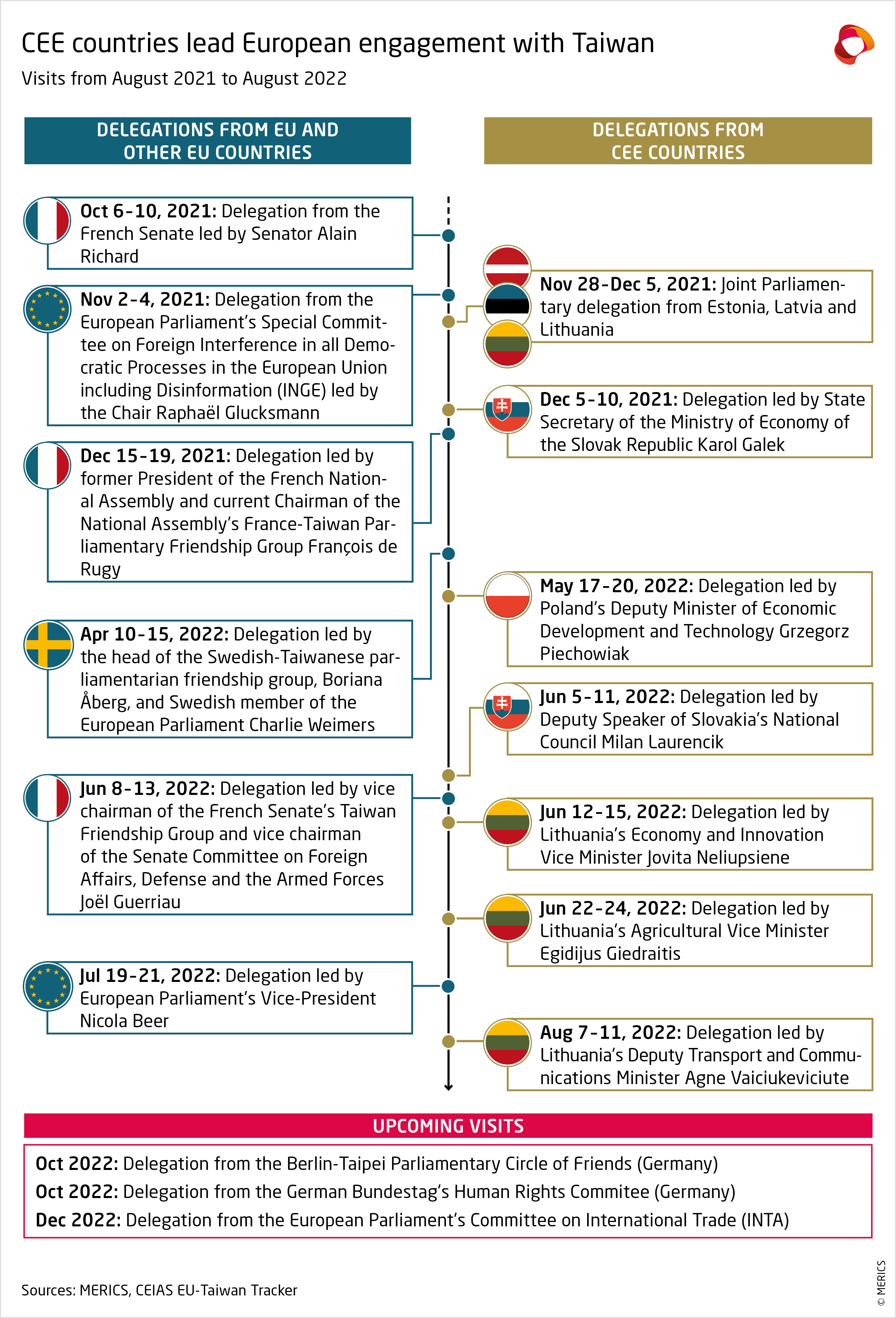 While European G7 countries may have signed an official statement, it is in fact member states from Central and Eastern Europe (CEE) who remain the frontrunners in European bilateral engagement with Taiwan. Lithuania, Czechia and Slovakia have been strengthening their relationship with Taiwan and their parliamentary delegations have the highest number of visits to Taiwan among Europeans, including less high-level visits which are not included in the graphic below. Warnings from Beijing seem to have had little effect, on the contrary, it has reaffirmed their conviction. For example, in December 2021, after China exercised economic coercion against Lithuania, Slovakia and Taiwan inaugurated a Taiwanese-Slovak Commission on Economic Cooperation. At the end of July, both Czechia and France hosted the visit of Taiwan's Legislative Speaker You Si-kun. The Lithuanian government still plans to open a trade representative office in Taiwan in September. And Lithuania’s Foreign Minister may be planning a visit to Taipei later this year.