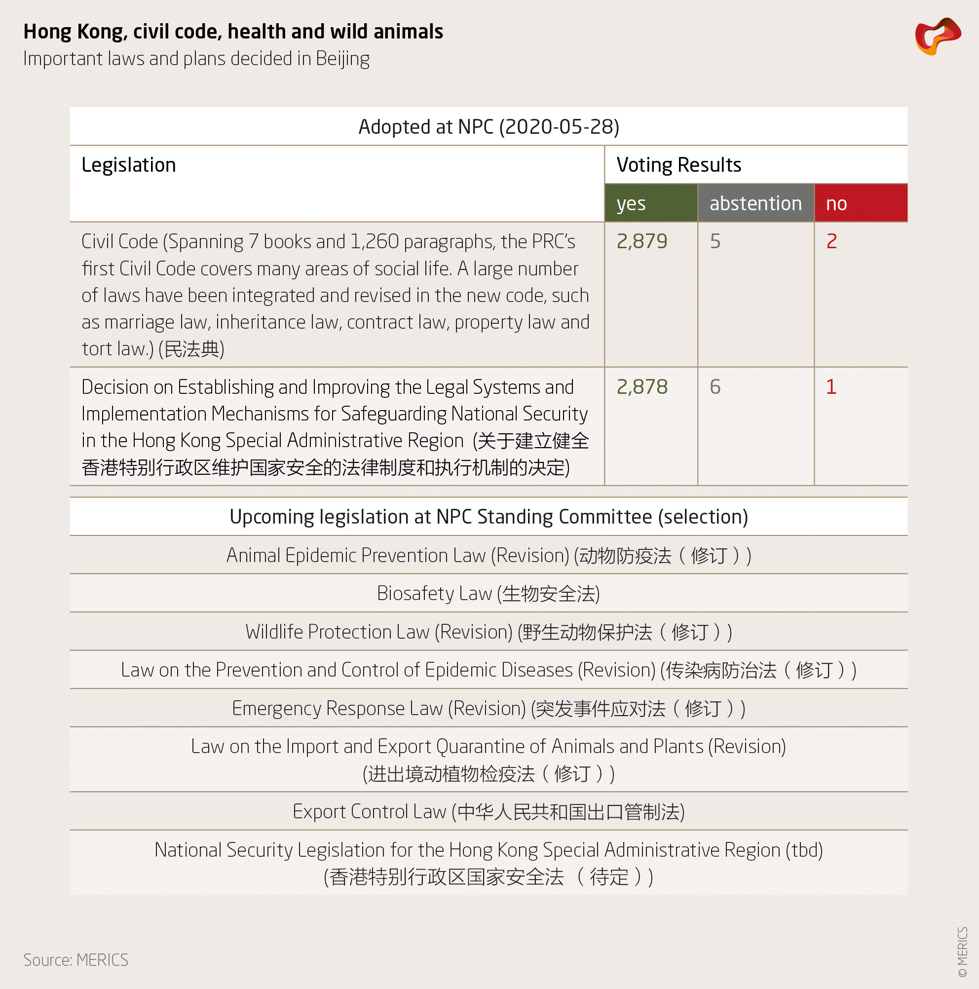 1 vote was registered against the decision by the National People’s Congress to draft national security legislation for Hong Kong. In all, 2,878 delegates voted in favor, with six abstentions. (Source: NPC Observer)