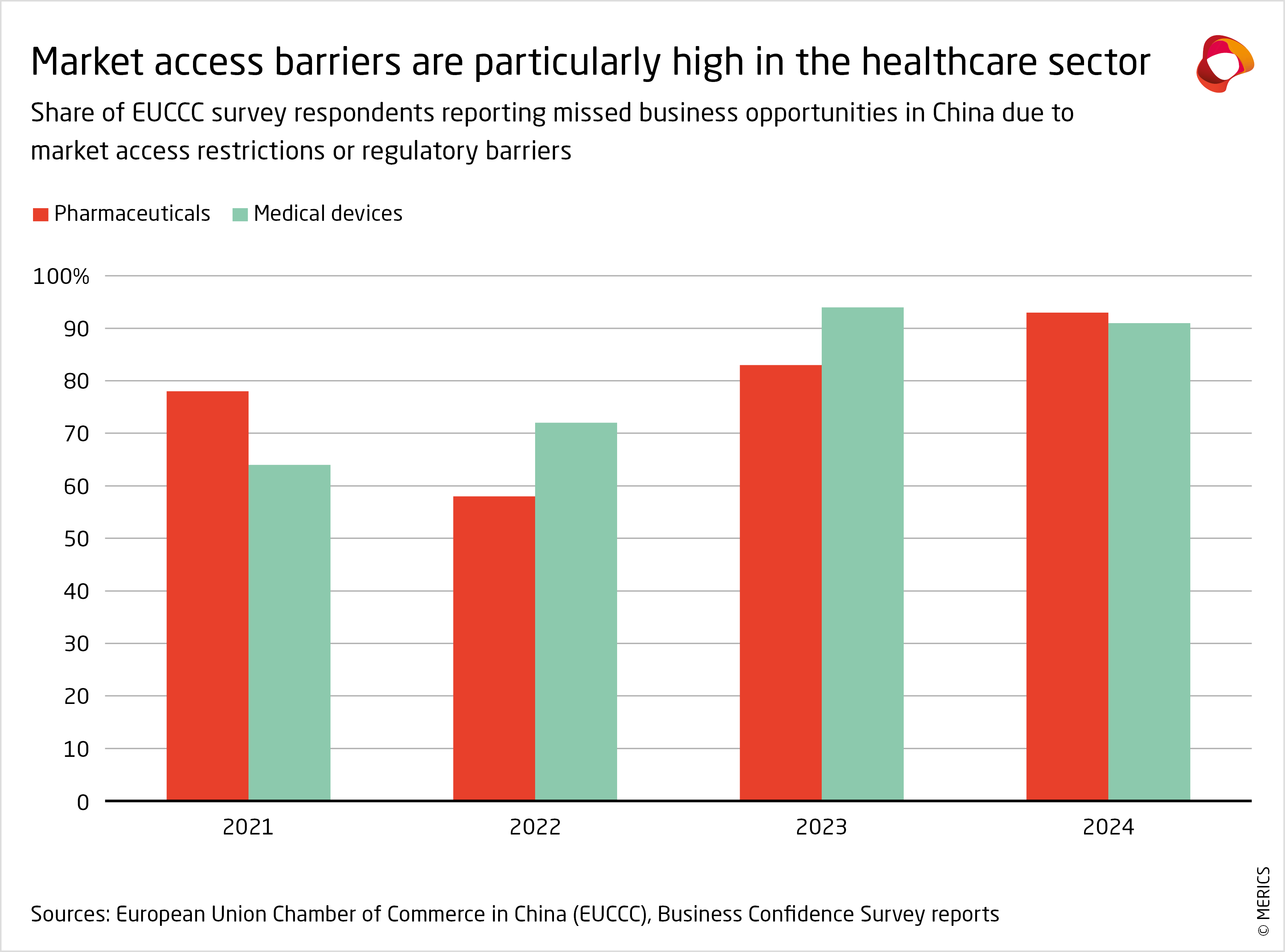 Officially, centralized procurement should not discriminate against foreign firms. But in practice it puts them at a disadvantage and advances the government’s localization efforts. Foreign firms are often unable to meet the drastic price reductions required to participate. Securing market share under such circumstances may require selling products at a loss. Following the introduction of VBP for artificial joints in 2021, the share of domestically produced products increased to 58.4 percent in 2022, up from 30 percent in 2020.