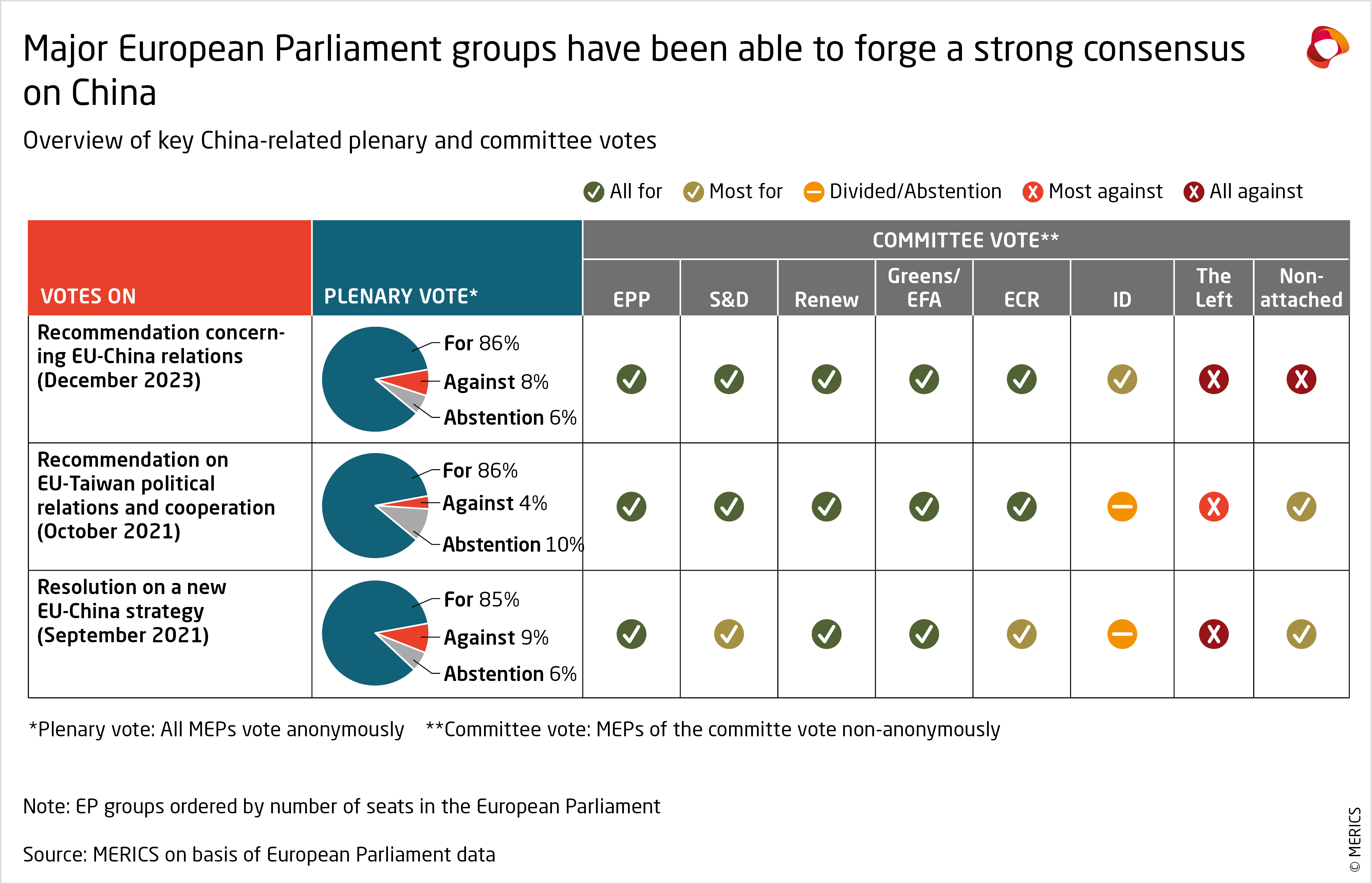 But looking only at manifestos does not paint a complete picture of the level of cohesion between EP parties on China. The voting patterns of China-related resolutions and reports highlight the EP’s ability to reach a strong consensus in its assessment of China.