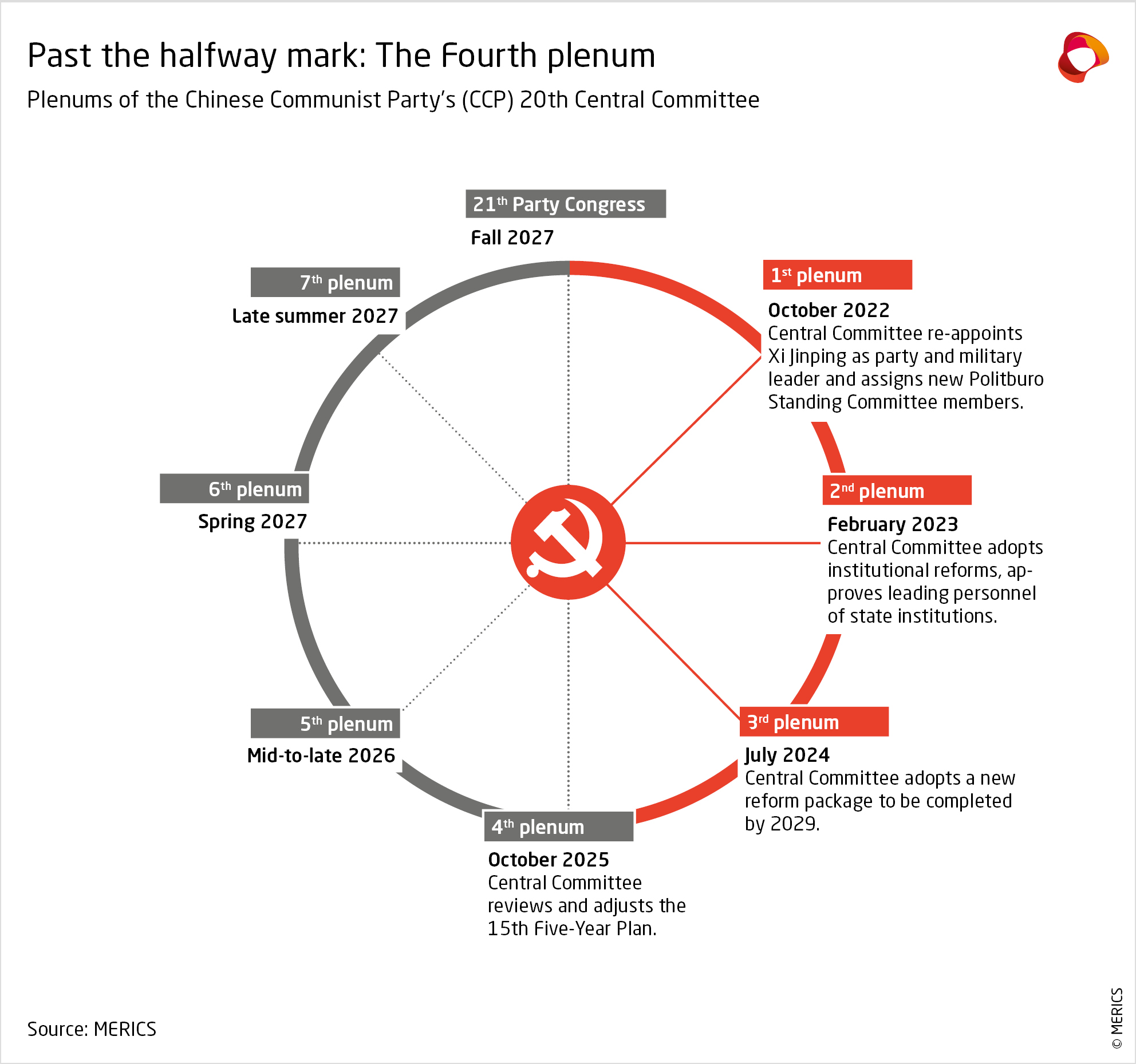 Geoeconomic clouds are hanging over a top-level political meeting on China's next Five-Year Plan. The roughly 370 members of the Chinese Communist Party’s (CCP) current Central Committee will next week gather in Beijing for the fourth so-called plenary session of their 2022-2027 term. This non-public event will focus on finetuning the CCP’s economic and social development blueprint for the coming years, an opening for targeted adjustments to China’s 15th Five Year Plan, which has long been in preparation, but won’t be finally adopted by China’s legislature until March 2026.