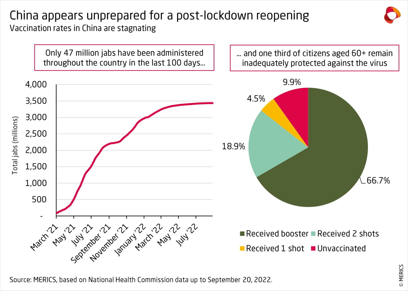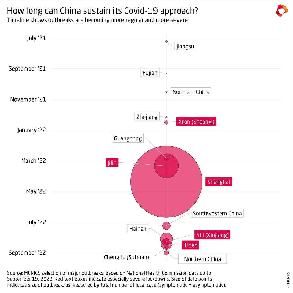 MERICS analysis: “Despite widespread public criticism in recent weeks, hopes for any change in China's zero-covid policy directly after the 20th Party Congress seem premature”, says MERICS Analyst Vincent Brussee. “By all known metrics, the country is less prepared for re-opening than it was in summer. Vaccination and booster rates have stagnated over the past months, so overall immunity may even have dropped as the protection of early vaccinations has worn off. Moreover, winter is coming, increasing pressure on China’s shaky healthcare system.”