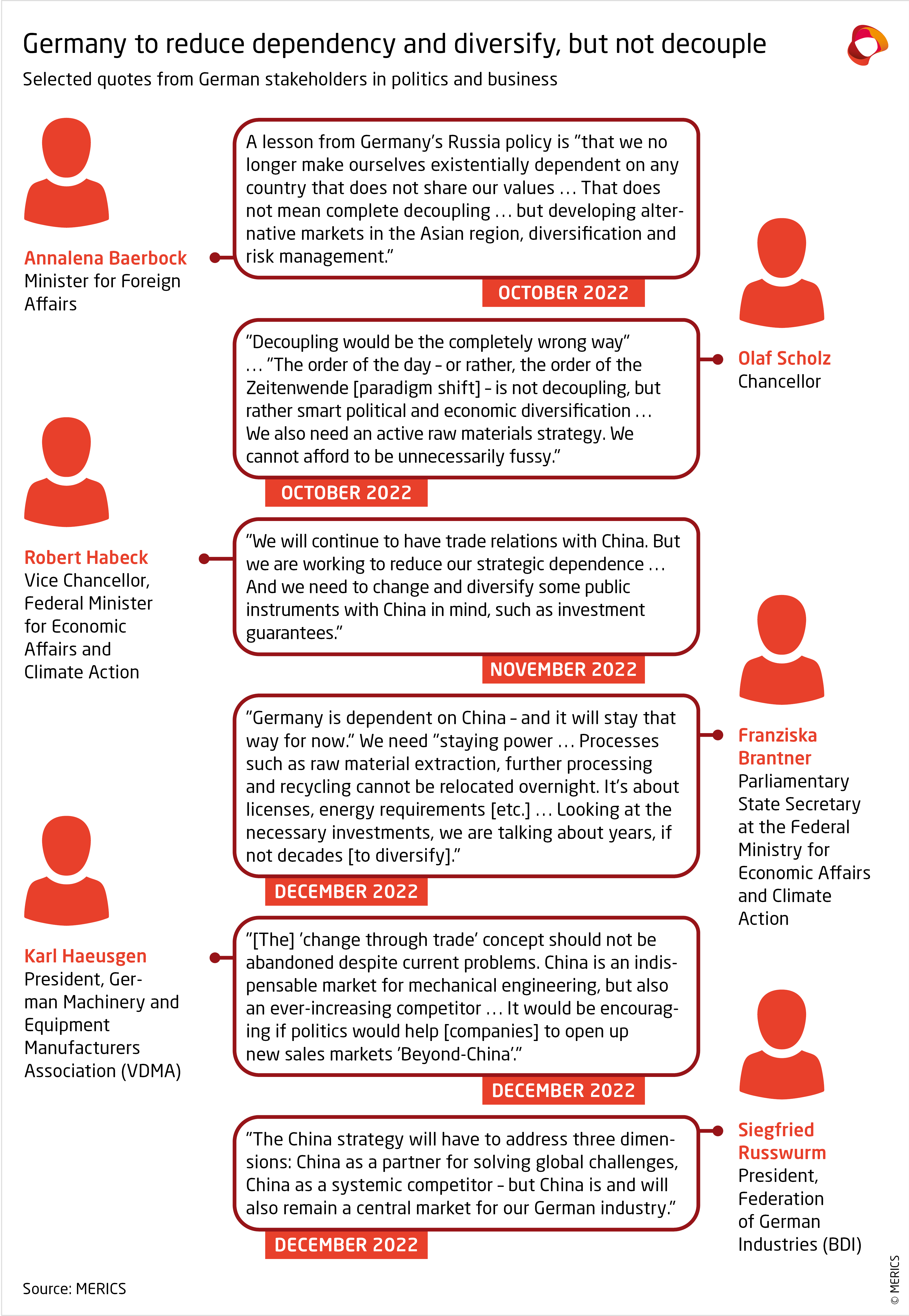 - German actors on economic dependence: The Chancellor, Vice Chancellor, and Foreign Minister are busy traveling Latin America, Africa, and India to find alternative exporters for specific goods that are currently majorly sourced from China. The government is calling on companies to diversify and is attempting to eliminate incentives, possibly by being more restrictive on providing investment guarantees for China. Medium-sized companies appear to be more active in this respect. Despite heightened geopolitical tensions and a potential cut in business ties due to a Taiwan conflict, larger German firms still look to strengthen their investments in China.