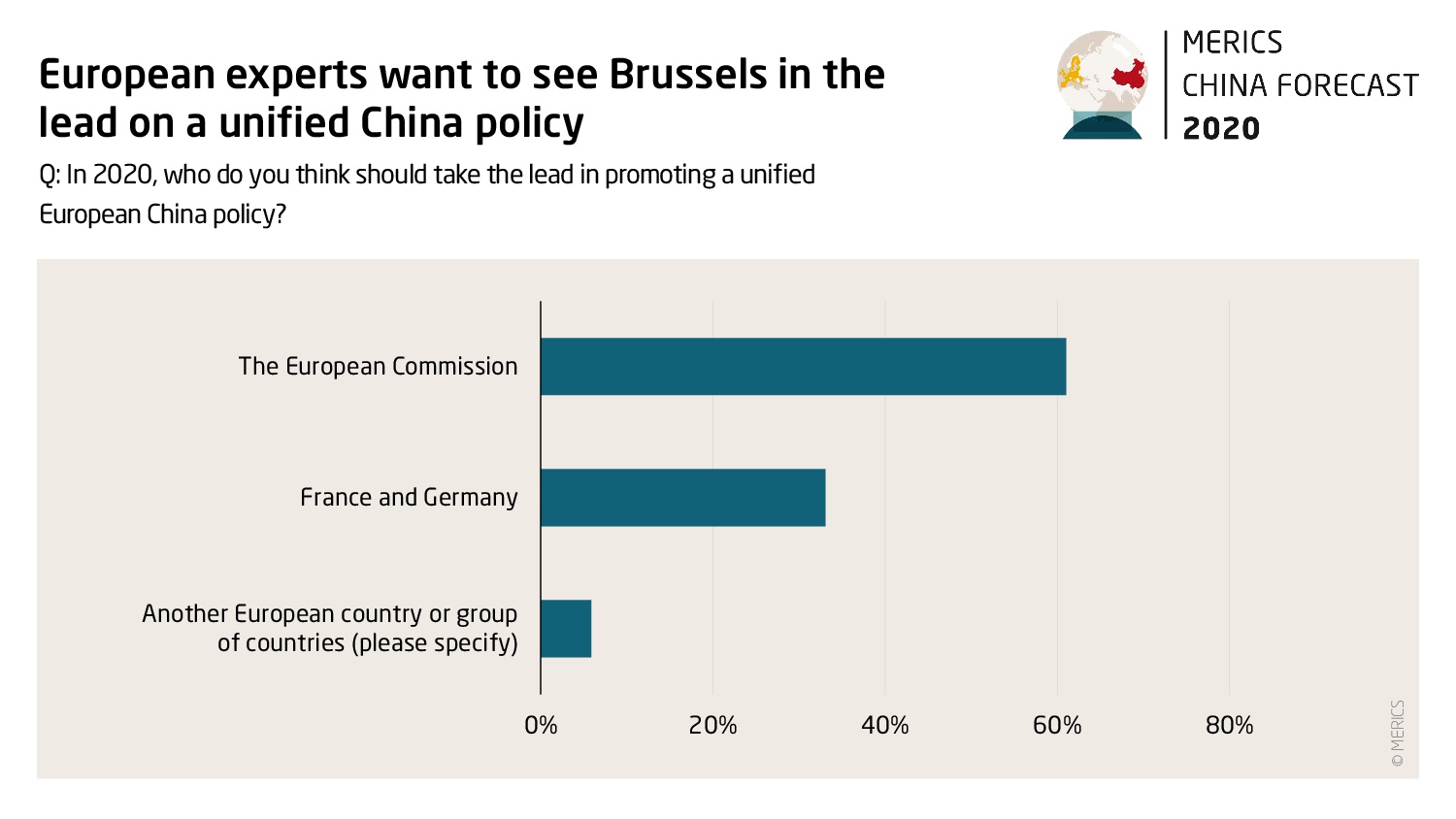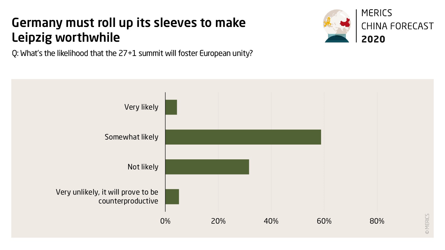 It’s up to the Europeans to make 2020 China’s “Year of Europe” Survey respondents were generally positive about the prospects of the Leipzig summit fostering European unity on China, with 59 percent saying this was somewhat likely and 4 percent saying this was very likely. But 37 percent said they expected no breakthroughs at the summit, and less than a third (27 percent) predicted that the EU and China would clinch a Comprehensive Agreement on Investment (CAI) in 2020, one of Chancellor Angela Merkel’s top priorities for Germany’s presidency of the EU in the second half of the year. Interestingly, only 33% of respondents want to see the EU’s traditional leadership duo, France and Germany, take the lead on a forging unified European China policy. More than 60% of those polled said they would prefer the European Commission to take on this role.