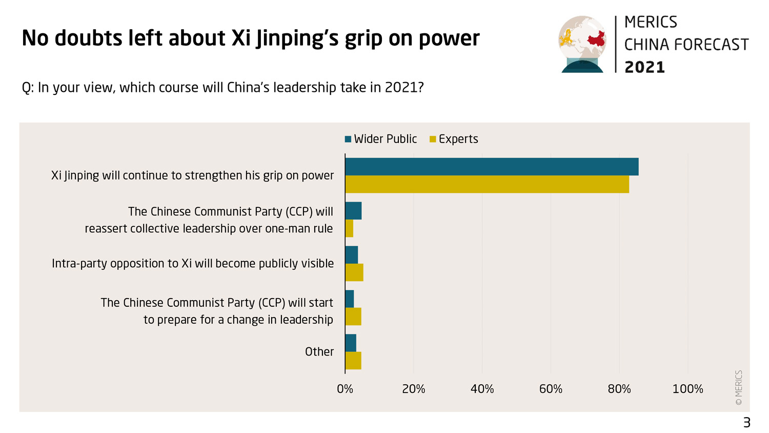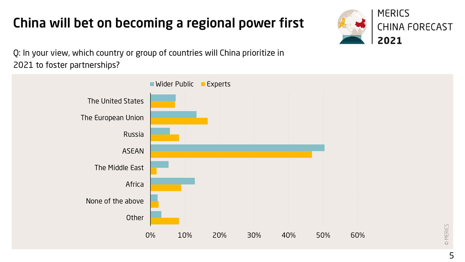At the same time respondents expect China in 2021 to focus mainly on fostering partnerships in Asia and on achieving post-coronavirus economic recovery and technological self-reliance. The country’s goal of scientific and technological self-sufficiency is expected to be at the center of its 14th Five-Year Plan, which will most likely be approved by the National People’s Congress in March. According to 44 per cent of the China experts, technological self-reliance will be the focus of China’s domestic politics, whereas 27 per cent think that socio-economic stability is the issue that keeps Beijing awake at night.