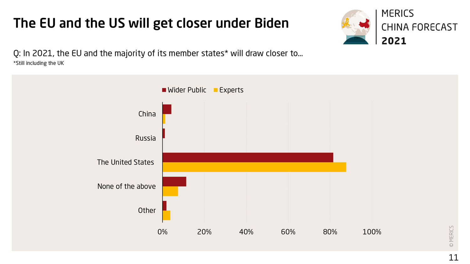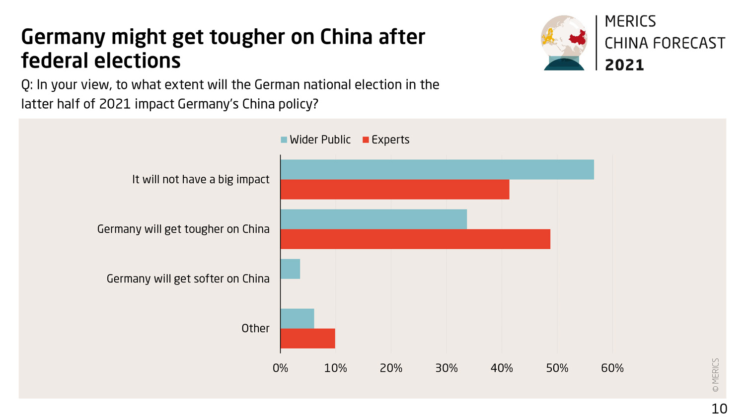 In recent years US-China relations have steadily deteriorated. For the coming year respondents see intensified tech and cyber competition between the two global powers. At the same time, 2021 could lead to a revival of the transatlantic partnership: 88 percent of China experts and 82 percent of the general public see the EU and its member states drawing closer to the United States under a Biden administration. And what about Sino-German relations? In September, Germans will elect Angela Merkel’s successor as Chancellor. Far from softening its stance towards Beijing after the election, almost 50 percent of China experts expect Berlin to get tougher on China.