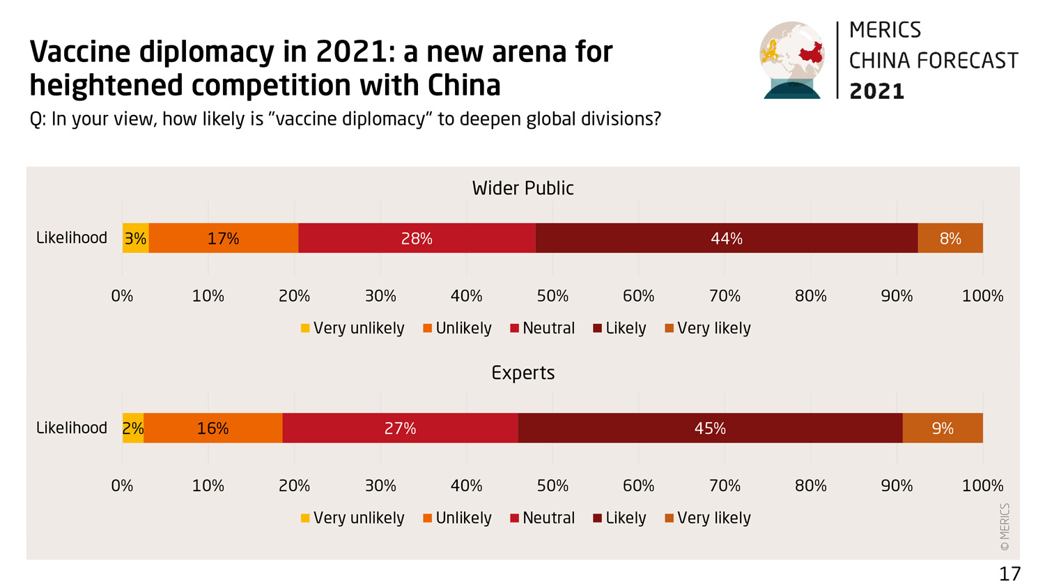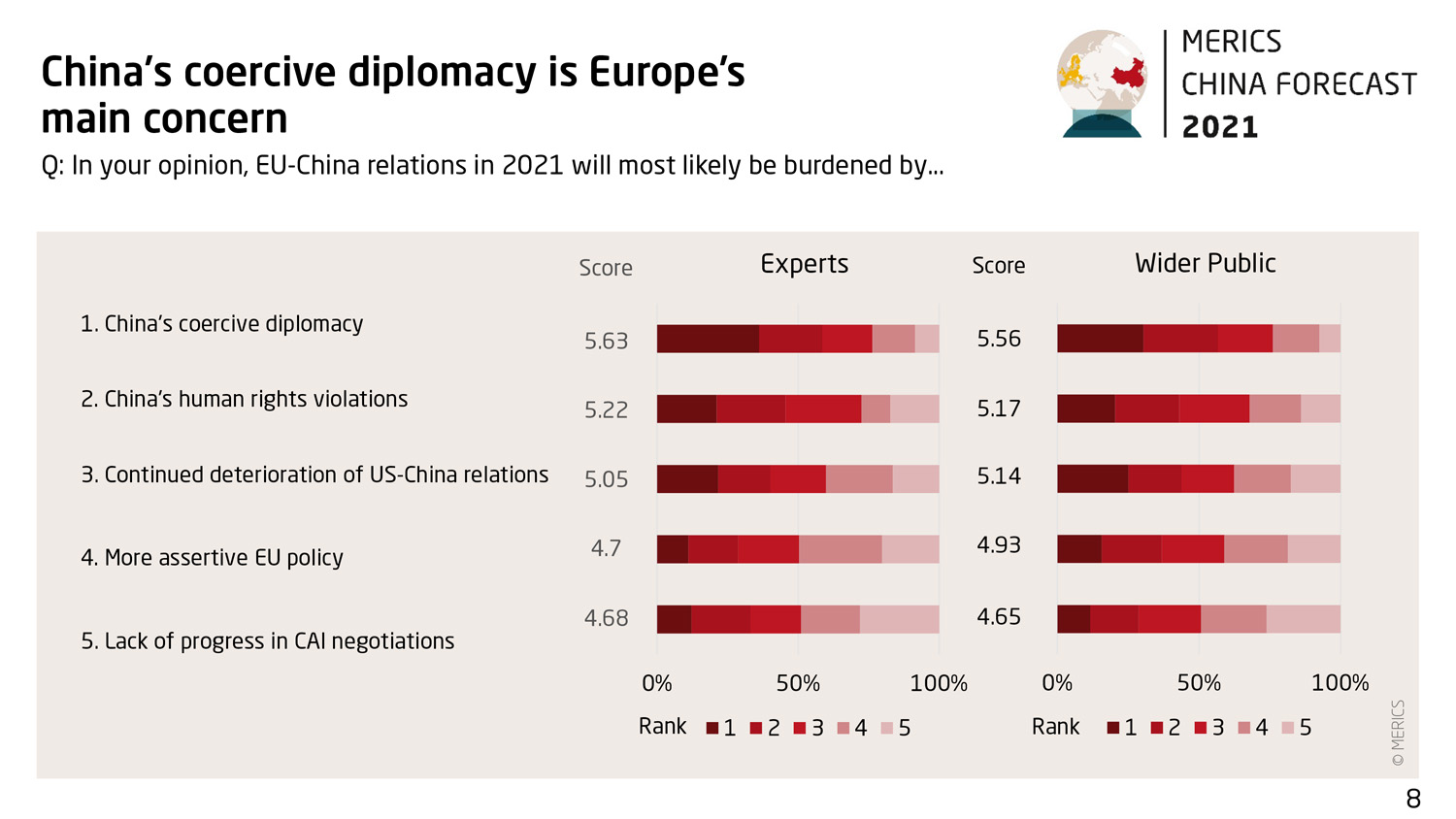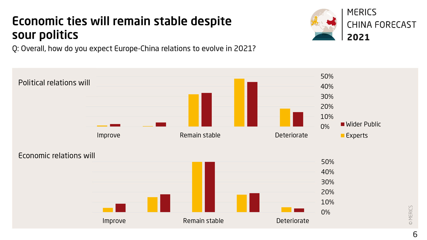 To shed some light on what observers think EU-China relations will look like in 2021, MERICS conducted a survey among 170 European China experts and roughly 1,000 members of the wider international public. A selection of the results was presented on January 13, 2021, at the MERICS China Forecast 2021 event and discussed by leading China specialists.