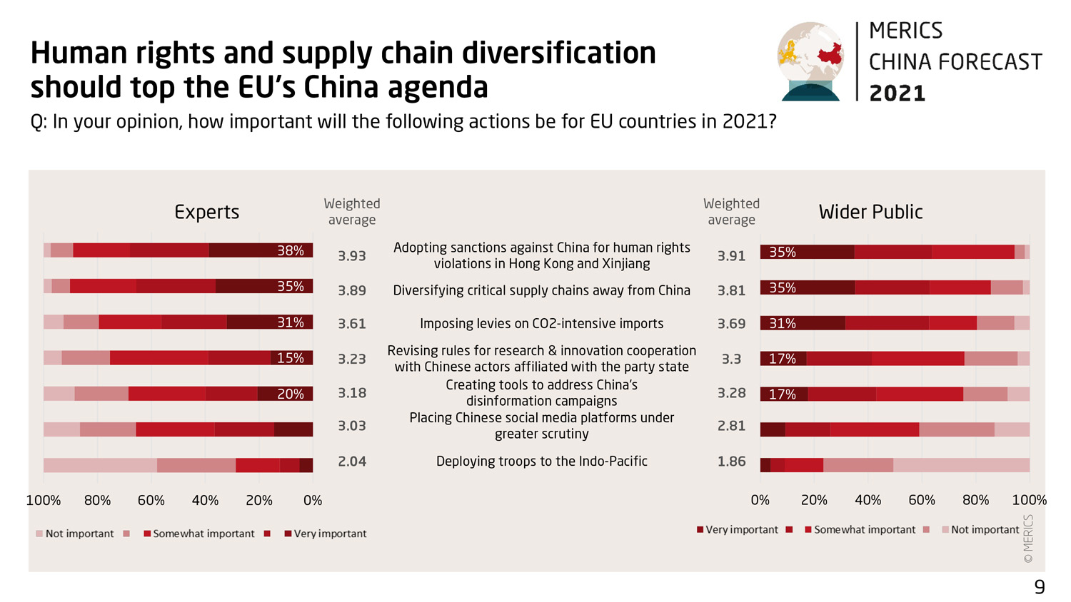 Asked which actions will be most important, survey respondents said the EU’s top priorities should be measures in response to Beijing’s human rights violations in Hong Kong and Xinjiang, and the diversification of supply chains to reduce exposure to China.