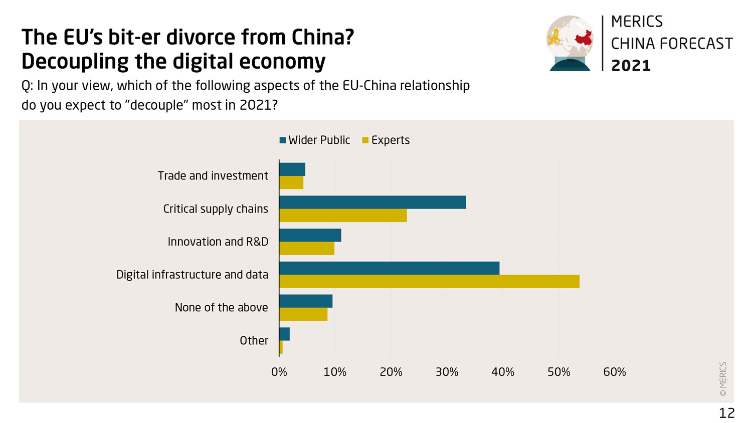 At the beginning of 2021, the Comprehensive Agreement on Investment (CAI) gave new momentum to EU-China relations. Late December’s conclusion in principle of negotiations occurred after most of the respondents had taken part in the survey. Policymakers around the world will be watching closely to see how the EU now manages to balance economic interests and systemic rivalry with China. Survey respondents think the two will continue to coexist: 66 percent of the experts surveyed expect political relations to deteriorate (seven percentage points more than last year!), but 50 percent of them also think that economic ties will remain stable. Respondents from the general public largely share these views. It is expected that decoupling will take place in the digital economy: 53 percent of the participating experts expect the areas most affected to be digital infrastructure and data followed by critical supply chains (23 percent of the respondents).