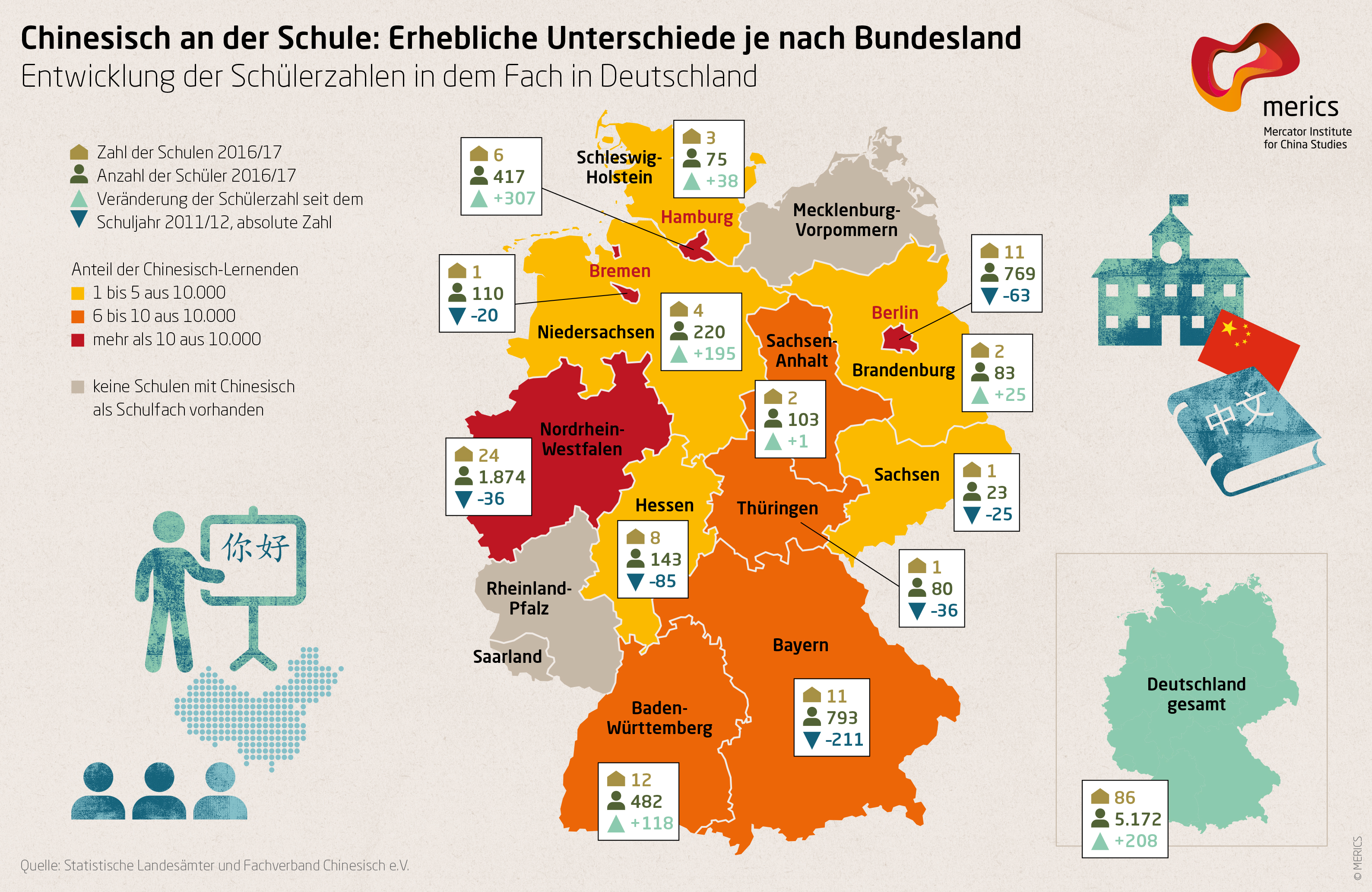 Im Schuljahr 2016/17 lernten von etwa 5,3 Millionen Schülern der Sekundarstufe in Deutschland mehr als 5000 Chinesisch im regulären Schulunterricht. In einigen Bundesländern gehört Chinesisch schon lange zum Fächerkanon und ist mitunter sogar Abiturfach. Andernorts gibt es jedoch noch weiße Flecken auf der Landkarte. Nach einem starken Anstieg in den 2000er Jahren hat sich die Entwicklung der Chinesisch-Schülerzahlen zuletzt wieder verlangsamt. Bundesweit stagnieren sie seit einigen Jahren und sind in einigen Bundesländern sogar deutlich rückläufig.