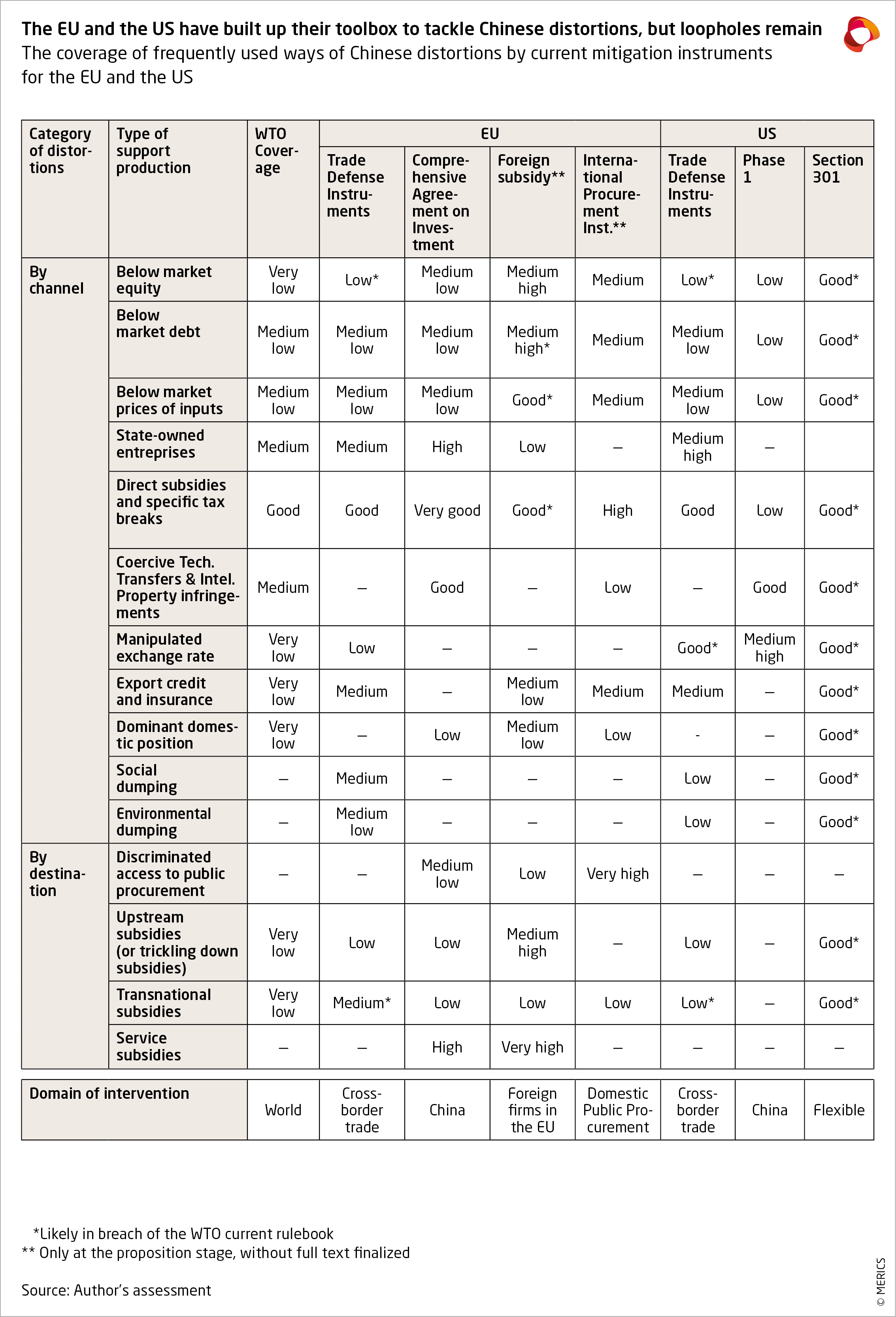 The first section reviews the possibility of cooperation towards an update of the international rulebook, especially at the WTO, with consideration for a second-best option of a liberal and rule-based plurilateral order. The second section looks at EU and US unilateral tools that could be used in parallel. The analysis describes recent evolutions of domestic stances, as well as efforts to cooperate, before assessing the prospects for greater cooperation (see Exhibit 3).