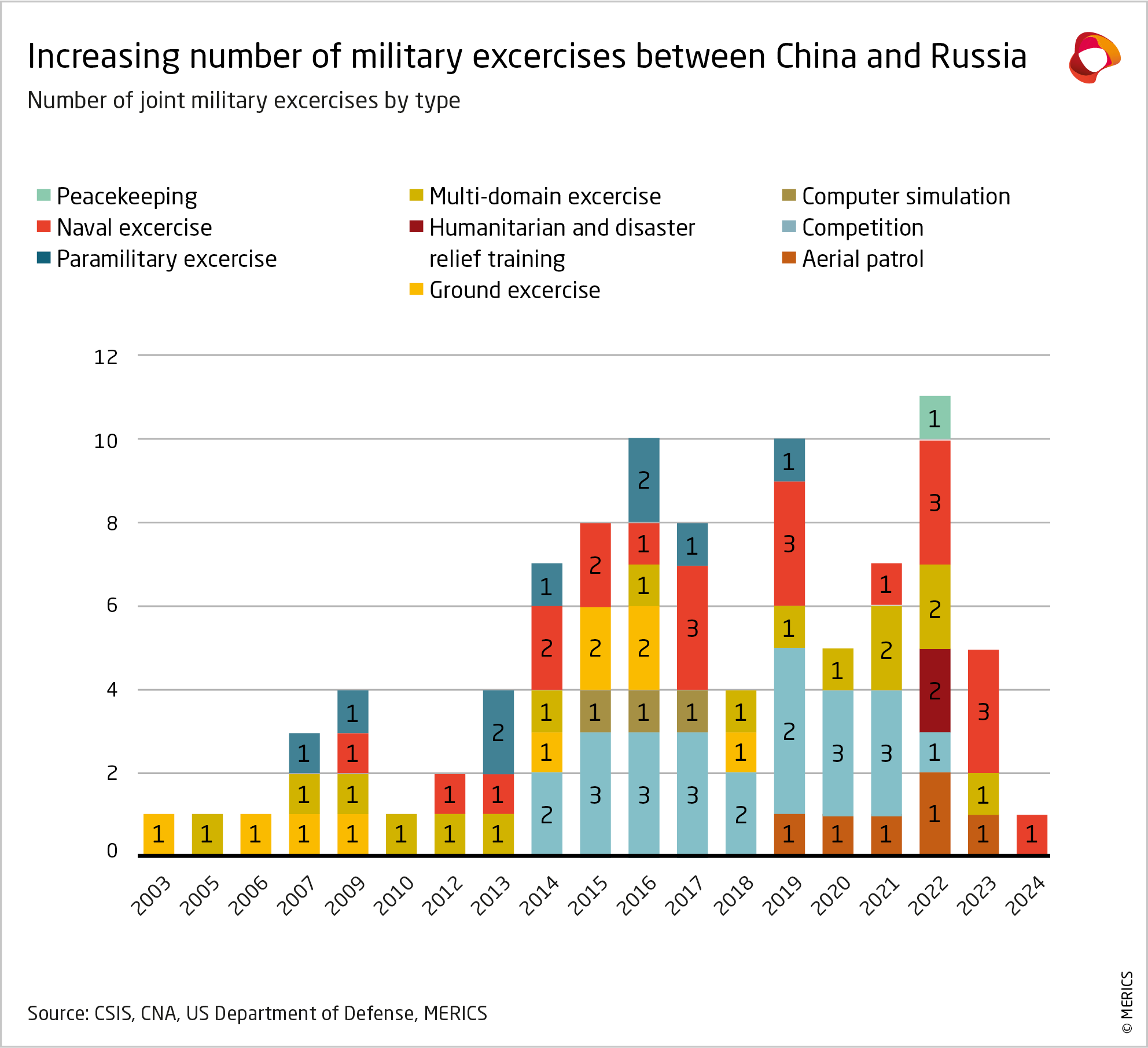 While not an imminent threat in Europe, this dynamic must be taken seriously in other regions, in particular the Indo-Pacific. At their May summit, Presidents Putin and Xi agreed to step up military ties, notably by expanding the scale of joint military exercises, more joint maritime and air patrols, and greater cooperation in bilateral and multilateral frameworks. Military cooperation between Russia and China has been steadily increasing, deepening interoperability between the two militaries. There have been joint navy maneuvers (e.g., December 2022 in the East China Sea and in the Gulf of Oman in March 2024 when Iran and Russia joined the “Marine Security Belt 2024” exercise),45 land military exercises (Exercise Vostok in September 2022 in Russia’s Far East, joined by 2000 Chinese troops)46 and cooperation on early missiles warning systems as well as joint patrols in Asia with nuclear-armed bombers47.