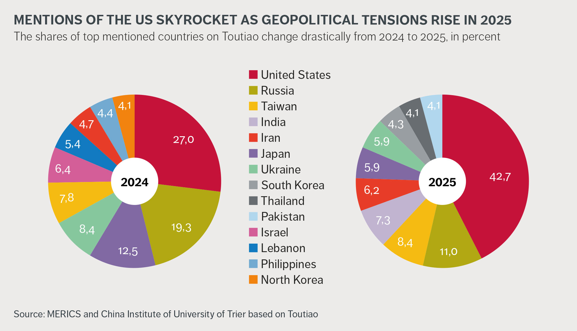 Recent analysis of Toutiao's headlines31 shows its geopolitical focus has shifted in 2025, with an increase in proportion of US coverage over stories on countries of the Global South. The proportion of US mentions, relative to the other top ten most-covered countries, has grown substantially, from 27 percent in 2024 to 42.7 percent in 2025.