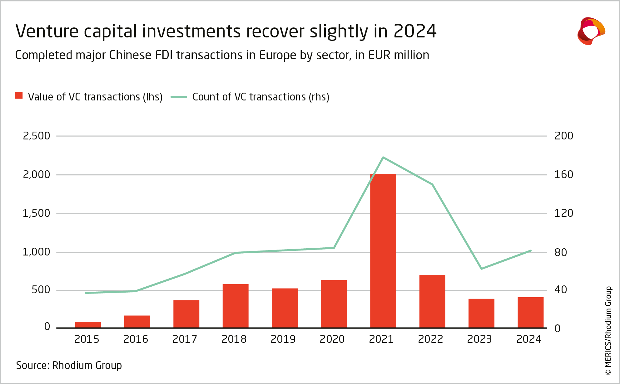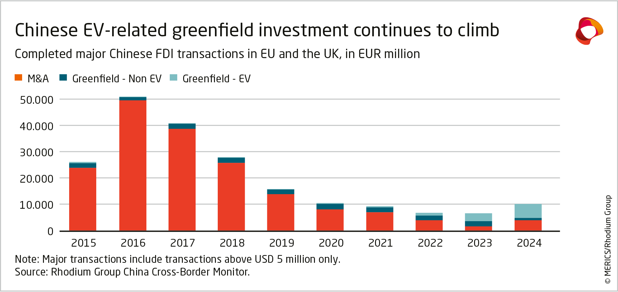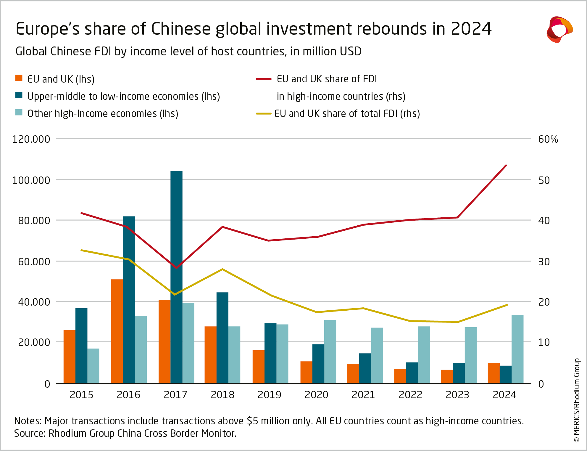 Chinese companies invested EUR 10 billion in the EU and the UK in 2024, 47 percent more than the year before. This represents only one fifth of the 2016 peak but is nonetheless the first significant rebound in Chinese investment in Europe since 2016.