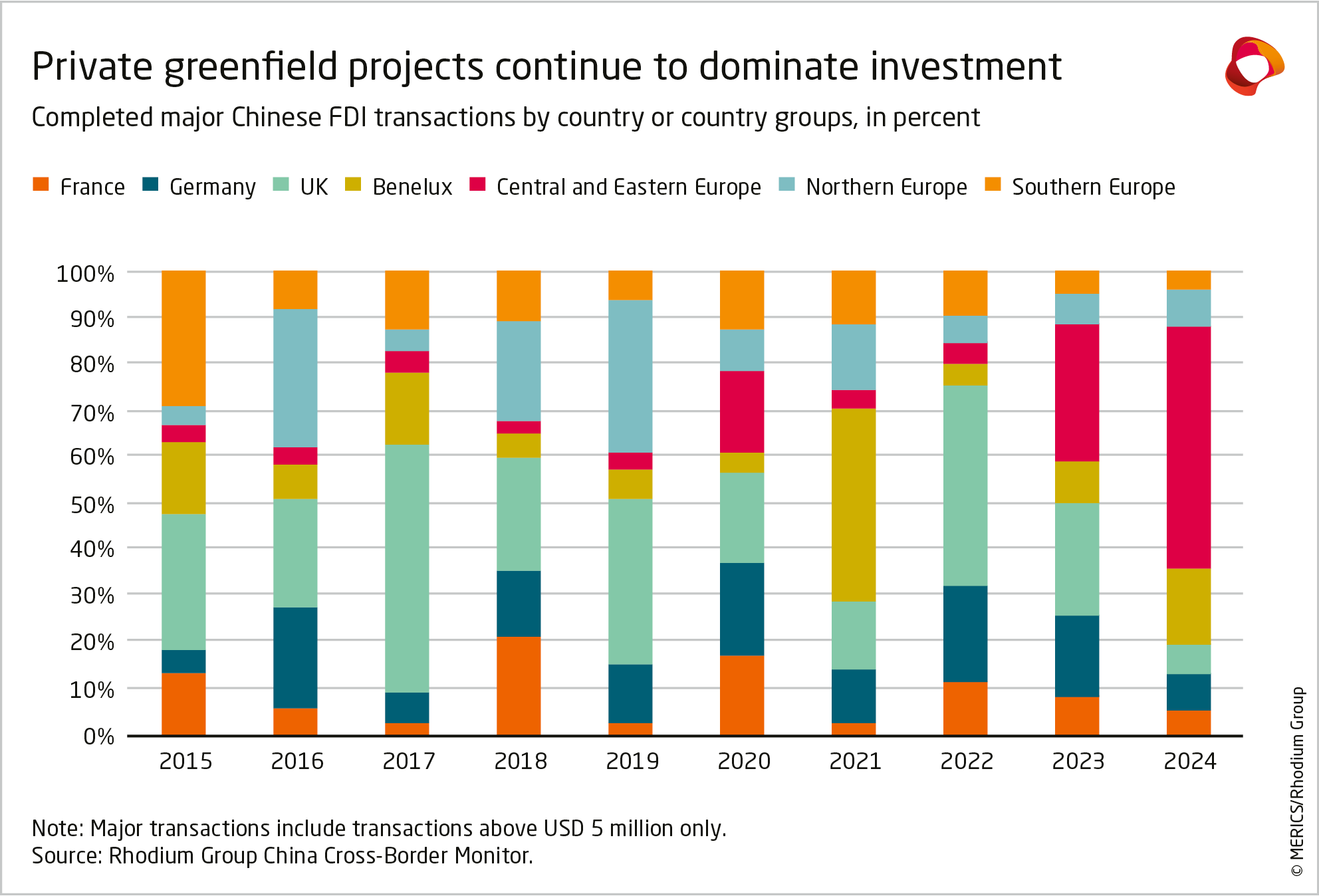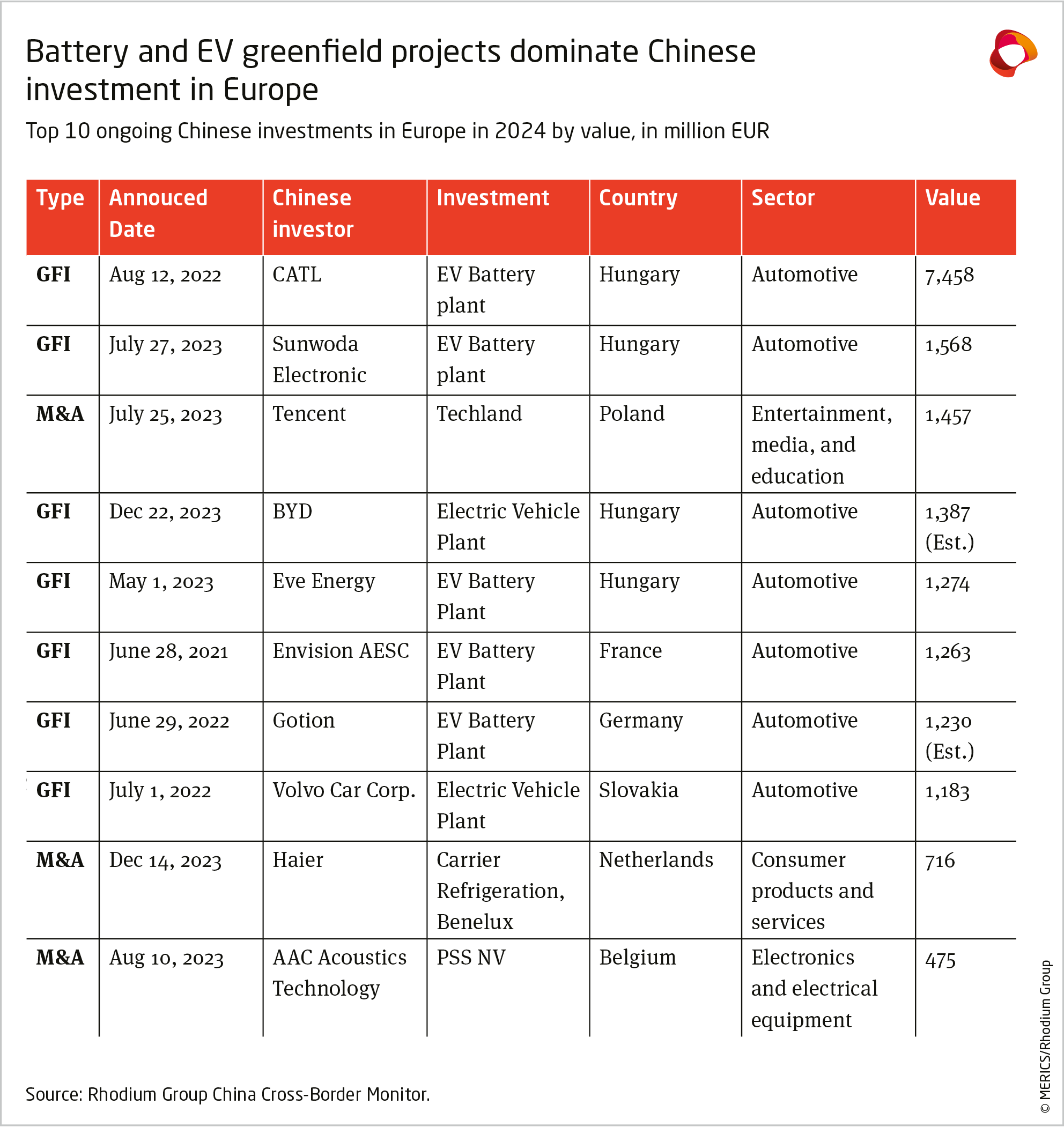 In 2024, a small group of highly active firms drove Chinese FDI into Europe. The top five investors—CATL, Tencent, Geely, Envision, and Gotion—accounted for almost half of total investments, a big jump from 35 percent on average the previous five years. CATL emerged as the leading investor in 2024, accounting for 16 percent of total investment, mostly from the ongoing construction of its battery plant in Hungary. This growing concentration reflects a broader trend: While fewer Chinese firms are investing in Europe, those that remain are scaling up significantly. Battery manufacturers such as CATL, Gotion, Envision, and Geely are rapidly expanding their production footprint across Western and Central Europe, with multiple gigafactory projects underway. Tencent, a leading Chinese M&A player in Europe, is accelerating its multibillion-euro acquisition spree in the video game sector. After two major transactions in recent years, Tencent is now planning a third for 2025—a EUR 1.1 billion acquisition of mobile game developer Easybrain. Over the past five years, Tencent has accounted for 8 percent of total Chinese FDI in Europe, just behind CATL’s 9 percent.