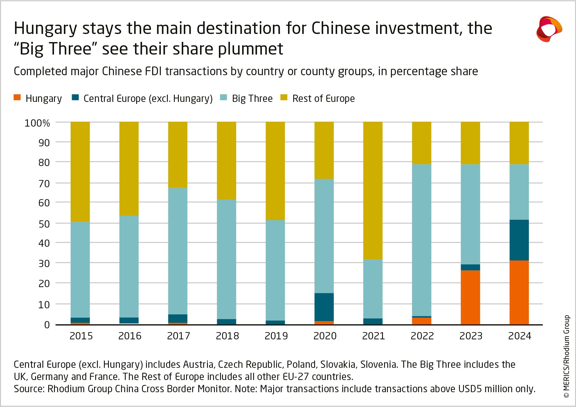 - Germany, France, and the UK lose ground as Hungary again takes the top spot: The combined share of the “Big Three”—the United Kingdom, Germany, and France—dropped to just 20 percent, sharply down from the 2019–2023 average of 52 percent. The decrease reflects both shifting investment patterns and a significant fall in overall investment. In contrast, Hungary—buoyed by capital-intensive greenfield projects—accounted for 31 percent of all Chinese FDI in Europe – the highest share of any country.