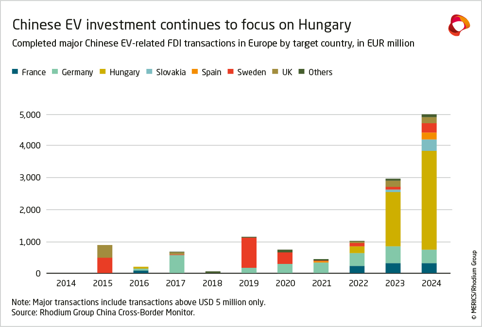 Hungary maintained its role as the top destination for Chinese investment in Europe for the second year in a row thanks to large-scale EV projects. Hungary attracted Chinese investments worth EUR 3.1 billion in 2024, up 73 percent from EUR 1.8 billion the previous year. In 2024, four of the top 10 ongoing Chinese investments in Europe were located in Hungary, including three EV battery plants and one electric vehicle plant.