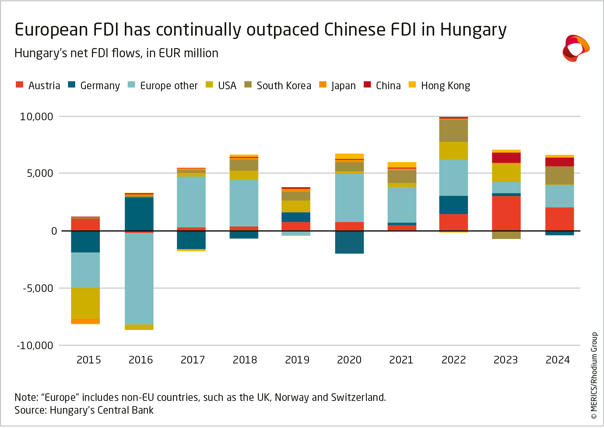 In terms of FDI stocks, China only ranks sixth among Hungary’s foreign investors, behind Germany, Austria, the United States, South Korea, and France. If Hong Kong is included, China moves up to fifth place, accounting for 5.6 percent of Hungary’s total FDI stock in 2023. In terms of flows, Chinese FDI (including from Hong Kong) accounted for 18.6 percent of Hungary’s net inbound FDI in 2024, but Chinese investors were still third to European as well as South Korean investors (also in the EV sector, yet with considerably less political fanfare). Cumulative US FDI the past three years also exceeded Chinese FDI in Hungary.