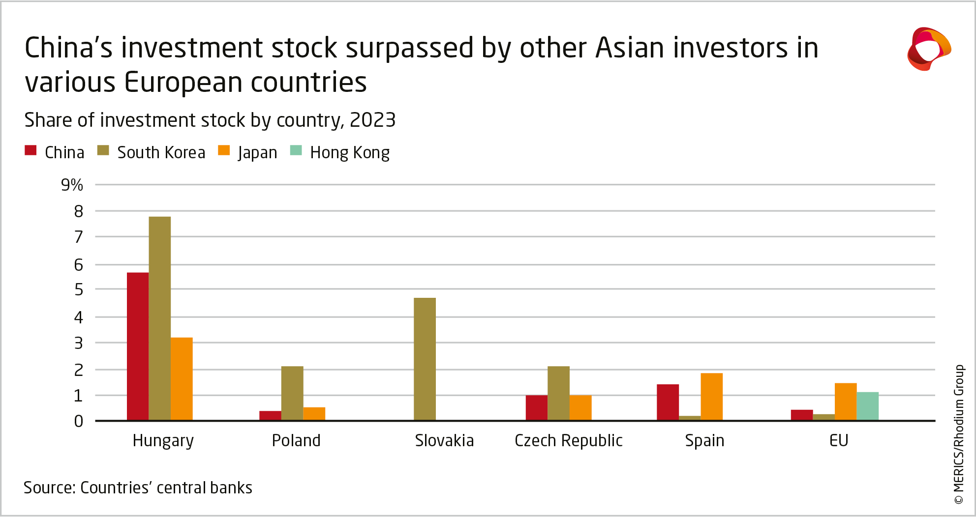 China today remains a relatively small investor in the EU, overshadowed by intra-European investments, as well as FDI from the United States and Japan (see exhibit 8). Even in Visegrád countries (Czech Republic, Hungary, Poland, and Slovakia) and Spain, where China’s investment has concentrated in recent years given the strength of local automotive supply chains, investment stocks from South Korea and Japan outstrip Chinese FDI. South Korea stands out as the dominant Asian investor in Central Europe, thanks to the presence of major battery producers such as LG, SK, and Samsung and automakers Hyundai and Kia. In Hungary, which attracted the lion’s share of Chinese FDI in Europe the past three years, China’s overall footprint is growing but still somewhat limited compared to other partners.