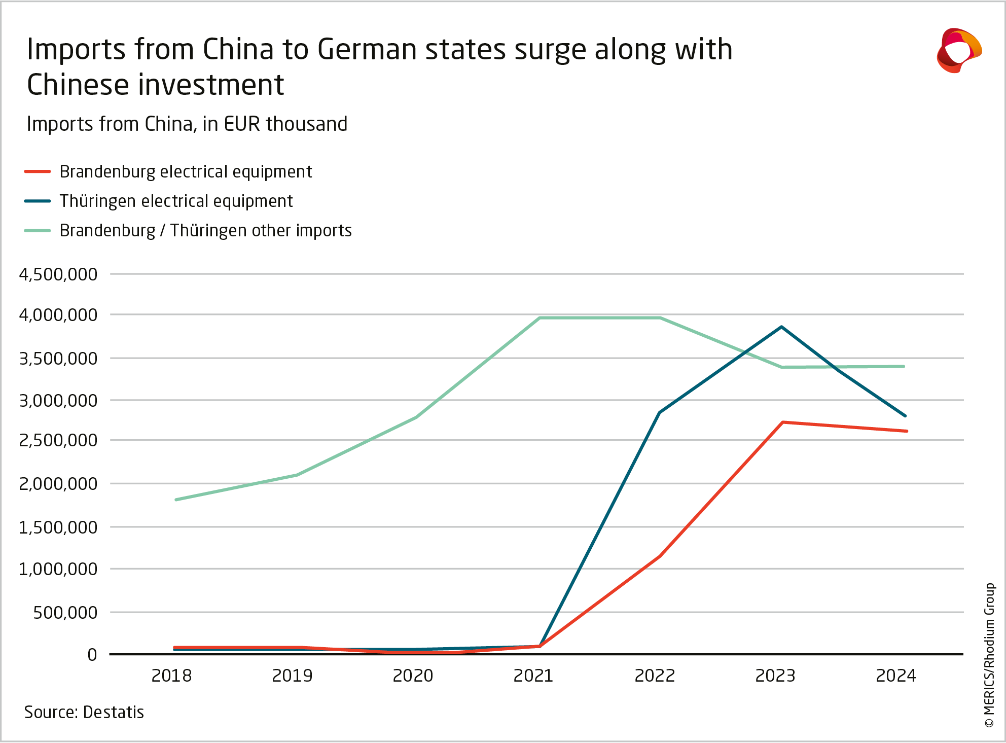 Beyond BYD, there are also signs that Chinese investment, and foreign investment more generally, tend to rely primarily on imports during their operations’ early stages. This is visible in the sharp rise in imports of electrical equipment from China into German states like Thuringia, where CATL began building a battery plant in 2019 and launched operations in 2023. But these trends can also be observed in Brandenburg, where Tesla’s Gigafactory broke ground in 2020 and began production in 2022.