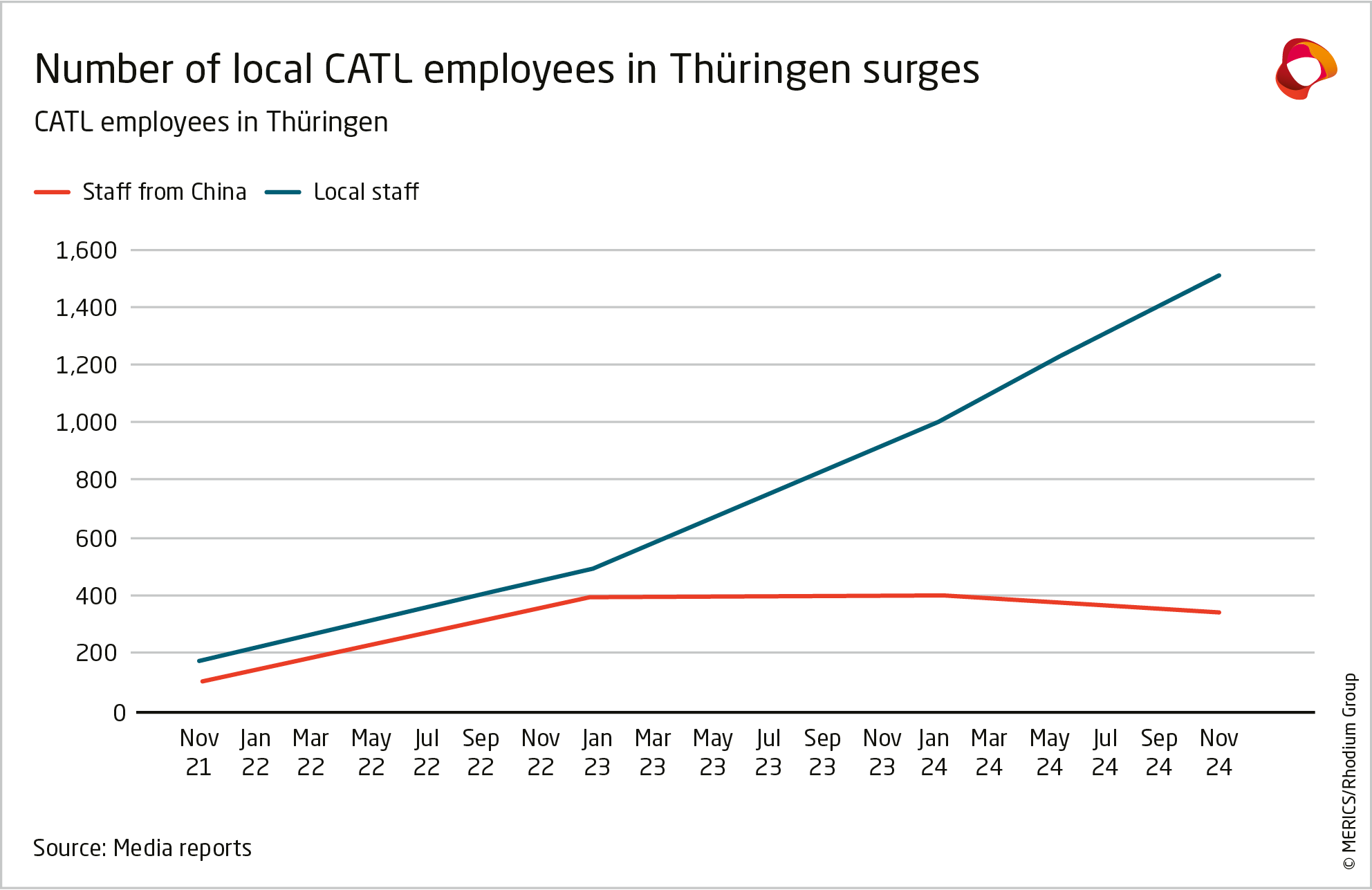 A few other case studies point to local value add increasing over time. When CATL began ramping up production at its German plant, PRC staff initially made up nearly half of the workforce, to provide technical expertise to set up production lines and train local staff on complex machinery and processes. But by late 2024, these made up only 23 percent of the workforce and their absolute numbers seem to have peaked in 2022–2023. As operations stabilized, most new hires were local, reflecting a gradual shift toward workforce localization. CATL’s investment in Germany also generated secondary local activity. In 2021, KDL Germany—a subsidiary of Kedali Shenzhen Industry—announced a EUR 60 million investment to produce aluminum castings for CATL batteries, with plans to create up to 290 local jobs.10
