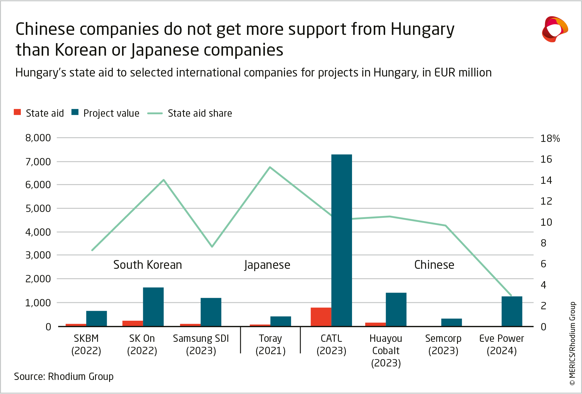 Hungary has also been handing out generous state support packages and may, though difficult to verify, impose fewer conditions linked to technology transfer, local workforce development or local content. By contrast, Rome tried to negotiate local content requirements with Dongfeng, a Chinese state-owned carmaker, including at least 45 percent of all components sourced in Italy data stored locally, in exchange for state aid. While Chinese firms do not seem to receive more support than Korean or Japan ones,11 Hungary probably benefits from the combination of state aid and limited conditions imposed on investors.
