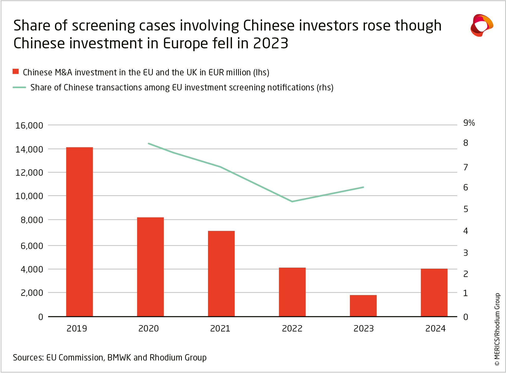 These concerns are reflected in recent trends in European reviews of Chinese FDI. According to the EU’s latest yearly investment screening report (covering 2023), the share of screened transactions involving Chinese companies rose for the first time in years—to 6 percent in 2023, up from 5.4 percent in 2022.13 This was despite Chinese FDI to Europe dropping from 2022 to 2023, especially via M&A transactions.