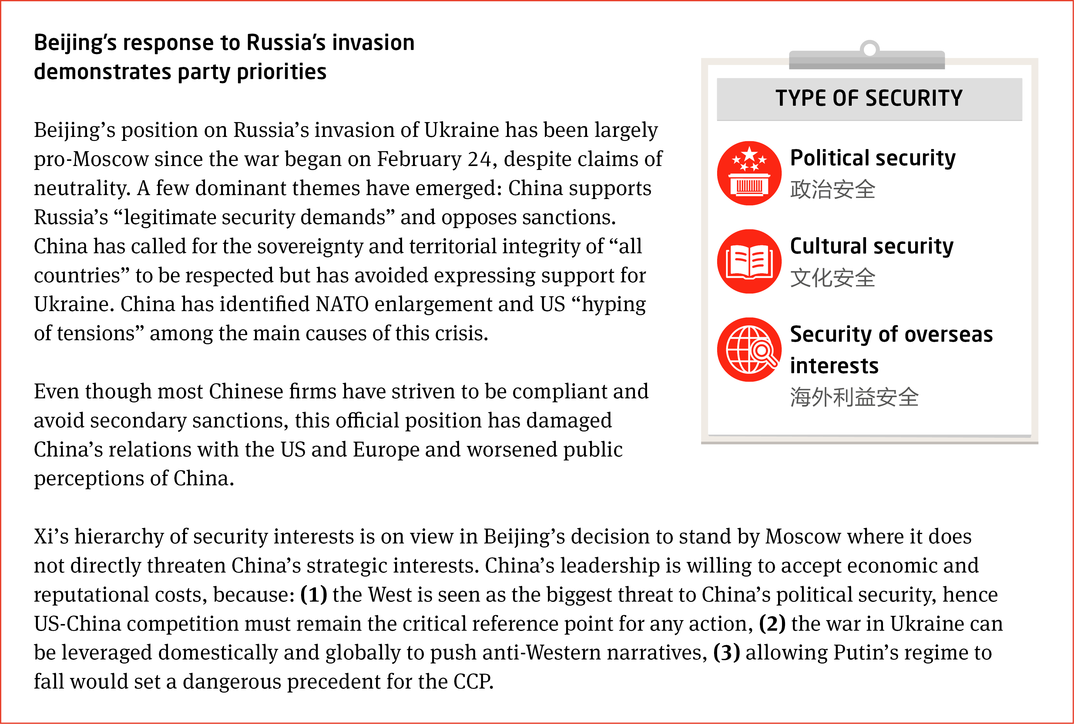 New, wider definitions of national security are emerging in many countries. However, China’s party and state leader Xi Jinping has turned national security into a goal in itself: his all-encompassing view of national security has become a core element of the Chinese Communist Party’s (CCP) world view and governance model. Amid rising tensions with Western nations, complicated by Russia’s war in Ukraine and global supply chain problems, this paradigm heightens the risk of overreactions.