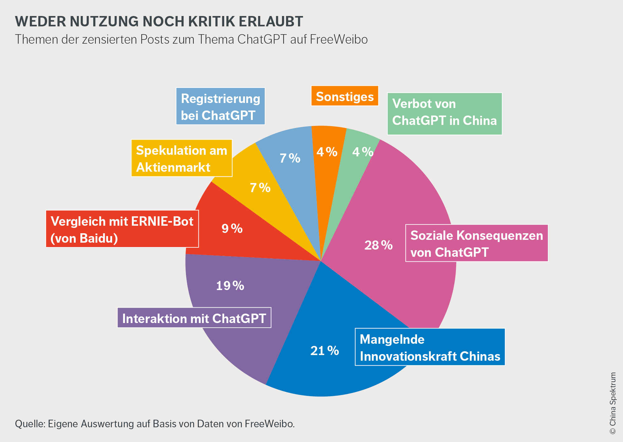 Auch Weibo-Diskussionen über soziale Konsequenzen der Nutzung von ChatGPT, z.B. Arbeitslosigkeit oder Vereinsamung, wurden teilweise von dem Plattformdienst gelöscht. Dies zeigt die ambivalente Haltung der Regierung. Die Behörden dulden zwar zurzeit die Nutzung von ChatGPT. Gleichzeitig versuchen sie, zu verhindern, dass das Thema auf Weibo eine große Reichweite erlangt.